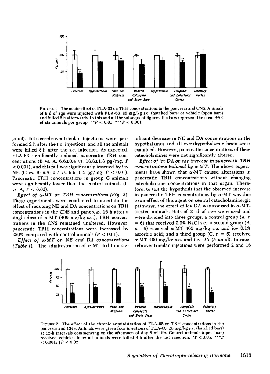 These studies have been undertaken to evaluate the role of the brain noradrenergic and dopaminergic pathways in the regulation of the secretion of thyrotropin-releasing hormone (TRH) in the central nervous system (CNS) and pancreas of the neonatal rat. When CNS stores of norepinephrine (NE) were selectively reduced by the subcutaneous administration of the dopamine-β-hydroxylase inhibitor FLA-63, TRH concentrations were significantly reduced throughout the brain. However, when CNS stores of both NE and dopamine (DA) were depleted by the subcutaneous administration of the tyrosine hydroxylase inhibitor α-methyl-ρ-tyrosine (α-MT), TRH concentrations in the brain were not significantly altered.