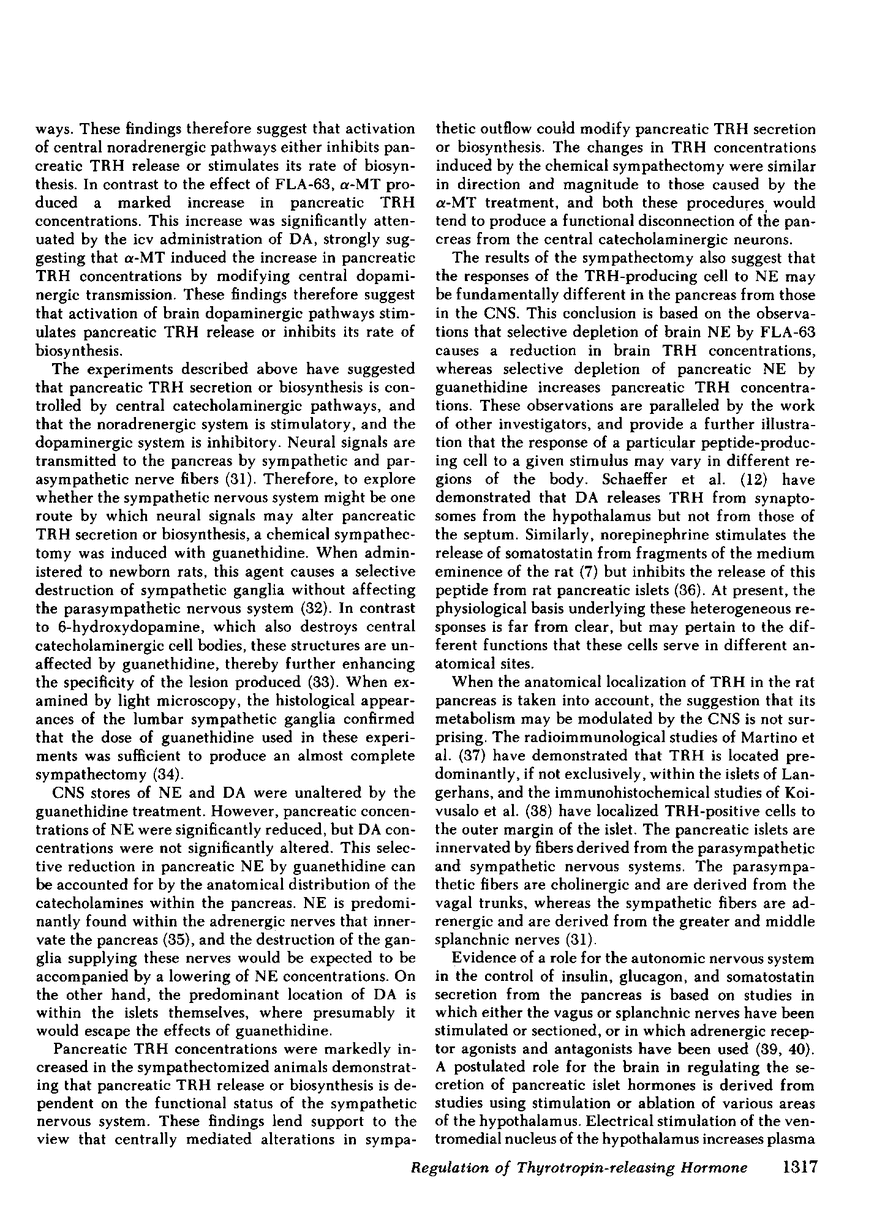 These studies have been undertaken to evaluate the role of the brain noradrenergic and dopaminergic pathways in the regulation of the secretion of thyrotropin-releasing hormone (TRH) in the central nervous system (CNS) and pancreas of the neonatal rat. When CNS stores of norepinephrine (NE) were selectively reduced by the subcutaneous administration of the dopamine-β-hydroxylase inhibitor FLA-63, TRH concentrations were significantly reduced throughout the brain. However, when CNS stores of both NE and dopamine (DA) were depleted by the subcutaneous administration of the tyrosine hydroxylase inhibitor α-methyl-ρ-tyrosine (α-MT), TRH concentrations in the brain were not significantly altered.
