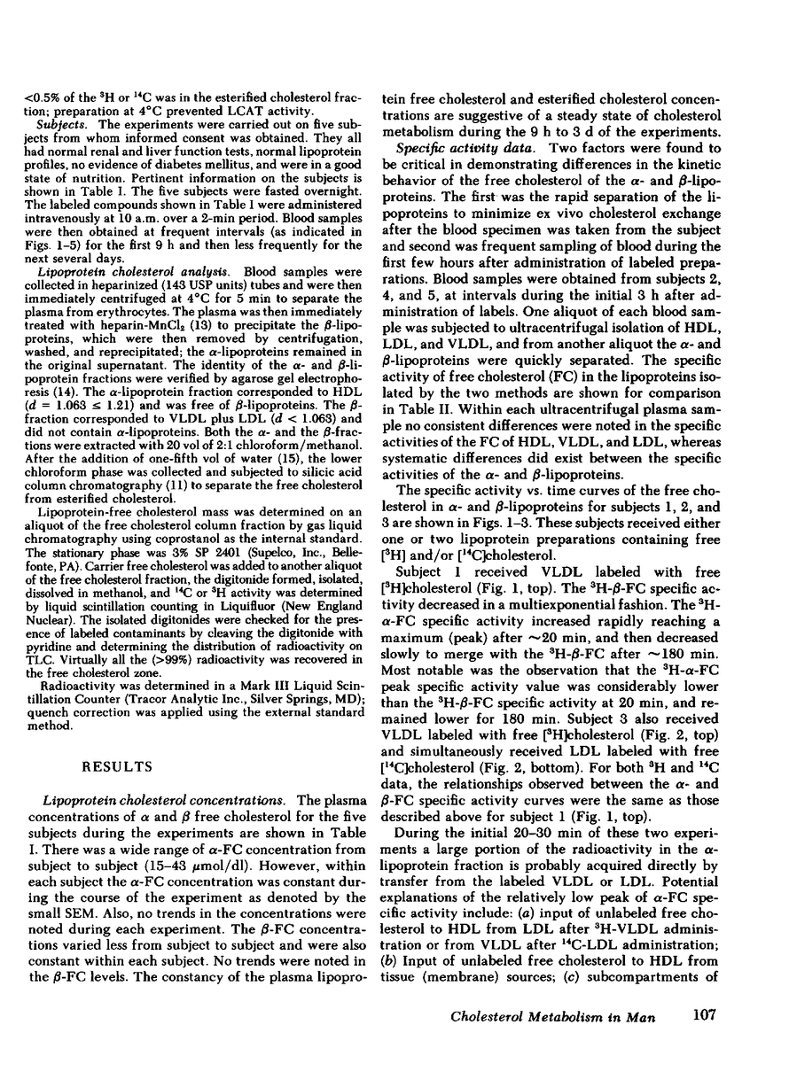 This study was designed to provide direct information on the in vivo metabolism in man of free (unesterified) cholesterol in the major lipoprotein classes. Five human subjects were administered one or two (simultaneous) of the following; [2-14C] mevalonic acid, high density lipoprotein (HDL)-free [14C] cholesterol, low density lipoprotein (LDL)-free [14C] cholesterol, and very low density lipoprotein (VLDL)-free [3H]cholesterol. Blood was then obtained at frequent intervals for at least 9 h, and the α(HDL) and β(LDL + VLDL) lipoproteins were quickly separated by heparin-manganese precipitation to prevent ex vivo exchange of free cholesterol. After the administration of [14C]mevalonic acid the specific activity (disintegrations per minute/micromole) of free cholesterol in the α- and β-lipoproteins increased for 3 h. During this period the α-free cholesterol specific activity was higher than the β specific activity. After administration of VLDL and LDL labeled with free cholesterol, the α-free cholesterol specific activity reached a peak value within 20 min, at which time it was considerably lower than the β-free cholesterol specific activity. When HDL labeled with free cholesterol was administered, a precursor product relationship was observed between the α-free cholesterol (precursor) and β-free cholesterol (product) specific activities.