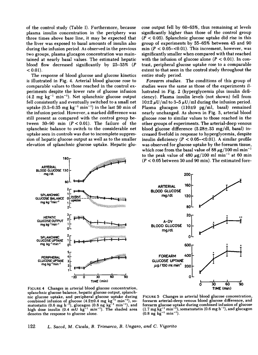 The present study was designed to investigate the mechanisms by which insulin regulates the disposal of an intravenous glucose load in man. A combined tracer-hepatic vein catheter technique was used to quantitate directly the components of net splanchnic glucose balance (NSGB), i.e., splanchnic glucose uptake and hepatic glucose output, and peripheral (extrasplanchnic) glucose uptake. Four different protocols were performed: (a) intravenous infusion of glucose alone (6.5 mg kg−1 min−1) for 90 min (control group); (b) glucose plus somatostatin (0.6 mg/h) and glucagon (0.8 ng kg−1 min−1; (c) glucose plus somatostatin, glucagon, and insulin (0.15 mU kg−1 min−1); and (d) glucose plus somatostatin, glucagon, and insulin (0.4 m U kg−1 min−1). In groups 2-4, arterial blood glucose was raised to comparable levels to those of controls (≃170 mg/dl) by a variable glucose infusion. In the control group, plasma insulin levels reached 40 μU/ml at 90 min. NSGB switched from a net output of 1.71±0.13 to a net uptake of 1.5-1.6 mg kg−1 min−1 due to a 90-95% suppression of hepatic glucose output (P < 0.01) and a 105-130% elevation of splanchnic glucose uptake (from 0.78±0.13 to 1.6-1.8 mg kg−1 min−1; P < 0.01). Peripheral glucose uptake rose by 150-160% (P < 0.01). In group 2, plasma insulin fell to <5 μU/ml. Net splanchnic glucose output initially rose twofold but later returned to basal values. This response was entirely accounted for by similar changes in hepatic glucose output since splanchnic glucose uptake remained totally unchanged in spite of hyperglycemia. In contrast, peripheral glucose uptake rose consistently by 100% (P < 0.01) despite insulin deficiency. In an additional group of experiments, glucose metabolism by the forearm muscle tissue was quantitated during identical conditions to those of group 2 (hyperglycemia plus insulin deficiency). Both the arterial-deep venous blood glucose difference and forearm glucose uptake increased markedly by 300-400% (P < 0.05 - <0.01). In group 3, plasma insulin was maintained at near-basal, peripheral levels (12-14 μU/ml). Hepatic glucose output decreased slightly by 35-40% (P < 0.05) while splanchnic glucose uptake remained unchanged. Consequently, the net glucose overproduction seen in group 2 was totally prevented although NSGB still remained as a net output. In group 4, peripheral insulin levels were similar to those of the control group (35-40 μU/ml). The suppression of hepatic glucose output was more pronounced (60-65%) and splanchnic glucose uptake rose consistently by 65% (P < 0.01). Consequently, NSGB did not remain as a net output but eventually switched to a small uptake (0.3 mg kg−1 min−1). Peripheral glucose uptake rose to the same extent as in controls.
