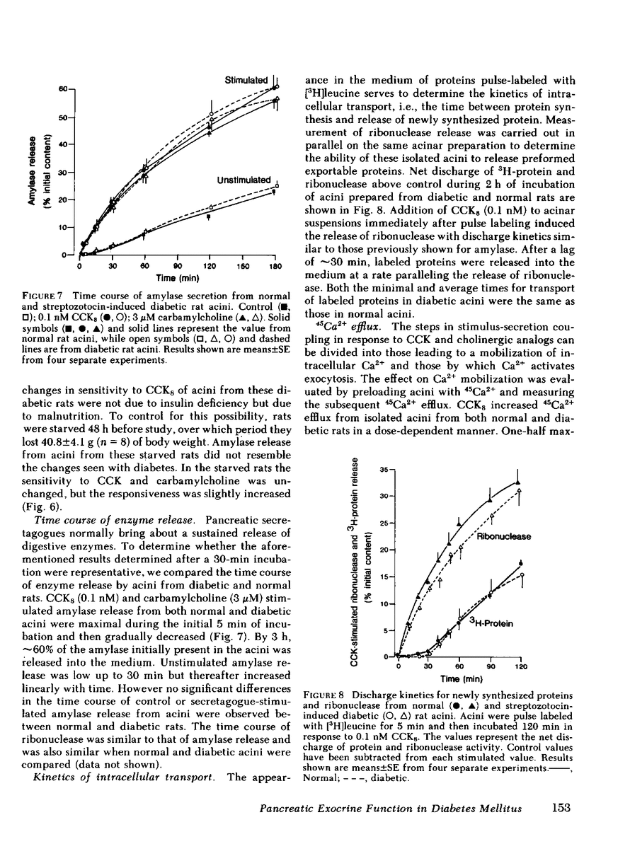 The nature and mechanism of the pancreatic exocrine dysfunction in diabetes mellitus were evaluated in vitro using isolated pancreatic acini prepared from streptozotocin-induced diabetic rats. The content of amylase and ribonuclease in diabetic acini was ∼0.5 and 50% of the normal content, respectively. Further, reduced amounts of both enzymes were secreted by diabetic acini in response to both cholecystokinin (CCK) and carbamylcholine. However, when enzyme secretion was normalized relative to initial acinar contents, both normal and diabetic acini released enzymes at a comparable maximal rate. The time course of the release of these enzymes, and newly synthesized protein were similar in both acini. In normal acini, the effect of CCK was maximal at a concentration of 100 pM; higher concentrations led to submaximal enzyme release. The dose-response curve in diabetic acini was similarly shaped, but shifted three-fold towards higher concentration. The mobilization of cellular Ca2+ in response to CCK was also shifted. In contrast to these results with CCK, the dose-response curve to carbamylcholine was unaltered by diabetes. The observed effects were confirmed to be due to insulin deficiency and not due to direct toxic effect of streptozotocin on acinar cells or malnutrition. Streptozotocin had no acute effect on acini when measured 24 h after administration, and alloxan, another beta cell toxin, induced similar changes in acinar enzyme content and secretory response. Moreover, the administration of exogenous insulin to diabetic rats returned the content of pancreatic amylase and the secretory response to CCK towards normal. Starvation for 48 h, although inducing a significant weight loss, did not mimic the effects of diabetes. The present studies demonstrate two major abnormalities in pancreatic exocrine secretion in the diabetic rat: (a) the content of certain digestive enzymes is markedly altered, leading to an altered amount of zymogen secretion, (b) the sensitivity to CCK is selectively reduced, most likely related to a defect in receptor activated transmembrane signaling.