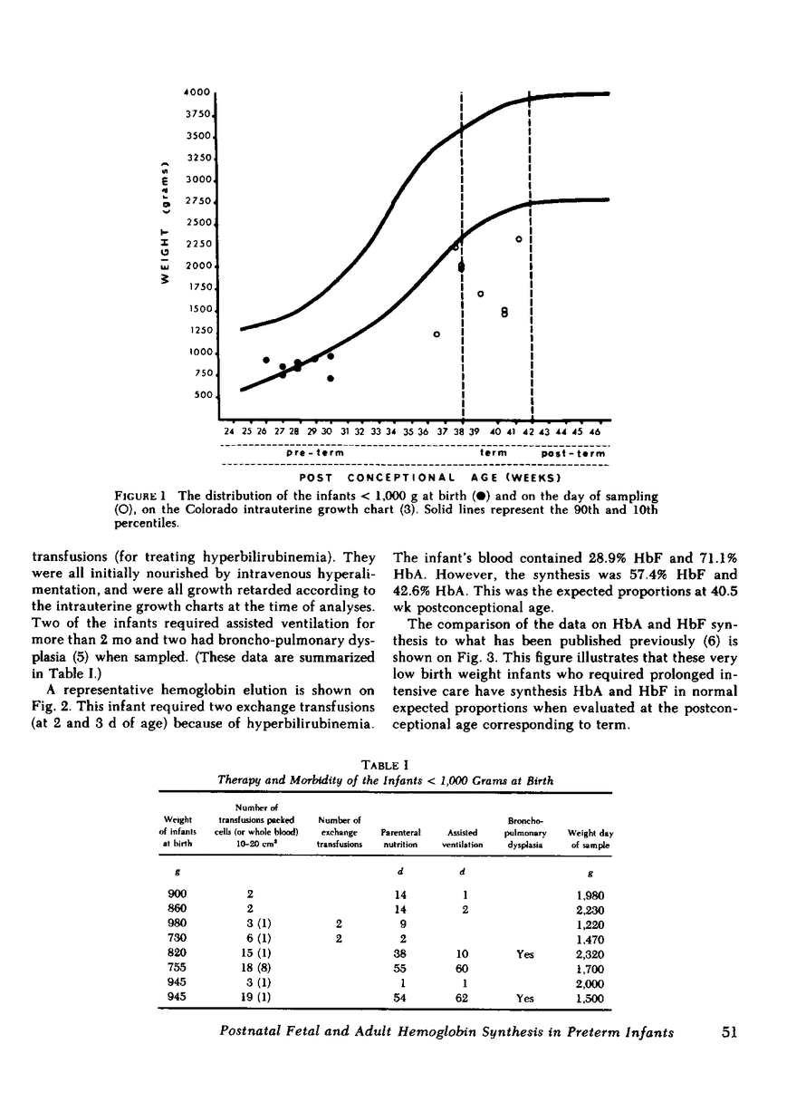 To determine if environmental factors could effect the switchover from fetal hemoglobin (HbF) to adult hemoglobin (HbA) synthesis, studies were carried out on blood samples from eight infants born at less than 1,000 g, when they had reached their postconceptional age corresponding to term. All of these infants required prolonged intensive care, multiple blood transfusions, and two required exchange transfusions. Several were ventilated mechanically for 60 d and two infants had bronchopulmonary dysplasia at the time of the study. The blood samples were incubated in an amino acid mixture containing [14C]leucine followed by column chromatography on DEAE Sephadex for separation of radioactive HbA and HbF. In spite of the extreme prematurity and poor growth of these sick infants, the proportional synthesis of HbF and HbA, as determined by the incorporation of [14C]leucine during the erythrocyte incubations, was characteristic of the period of human development from which the erythrocytes were obtained.