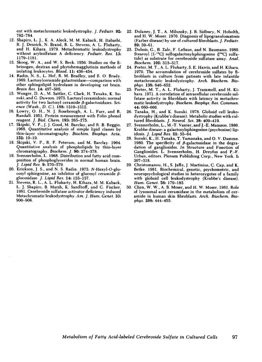 [14C]Stearic acid-labeled cerebroside sulfate (CS) was presented to cultured skin fibroblasts in the media. After endocytosis into control cells 86% was readily metabolized to galactosylceramide, ceramide, and stearic acid, which was reutilized in the synthesis of the major lipids found in cultured fibroblasts. Uptake and metabolism of the [14C]CS into cells from typical and atypical patients and carriers of metachromatic leukodystrophy (MLD), Krabbe disease, and Farber disease were observed. Cells from patients with late infantile MLD could not metabolize the CS at all, while cells from an adult MLD patient and from a variant MLD patient could metabolize ∼40 and 15%, respectively, of the CS taken up. These results are in contrast to the in vitro results that demonstrated a severe deficiency of arylsulfatase A in the late infantile and adult patient and a partial deficiency (21-27% of controls) in the variant MLD patient. Patients with Krabbe disease could metabolize nearly 40% of the galactosylceramide produced in the lysosomes from the CS. This is in contrast to the near zero activity for galactosylceramidase measured in vitro. Carriers of Krabbe disease with galactosylceramidase activity near half normal in vitro and those with under 10% of normal activity were found to metabolize galactosylceramide in cells significantly slower than controls. This provides a method for differentiating affected patients from carriers with low enzyme activity in vitro. Cells from patients with Farber disease could catabolize only ∼15% of the ceramide produced from galactosylceramide. This technique provides a method for the identification of typical and atypical patients and carriers of three genetic diseases using one substrate.