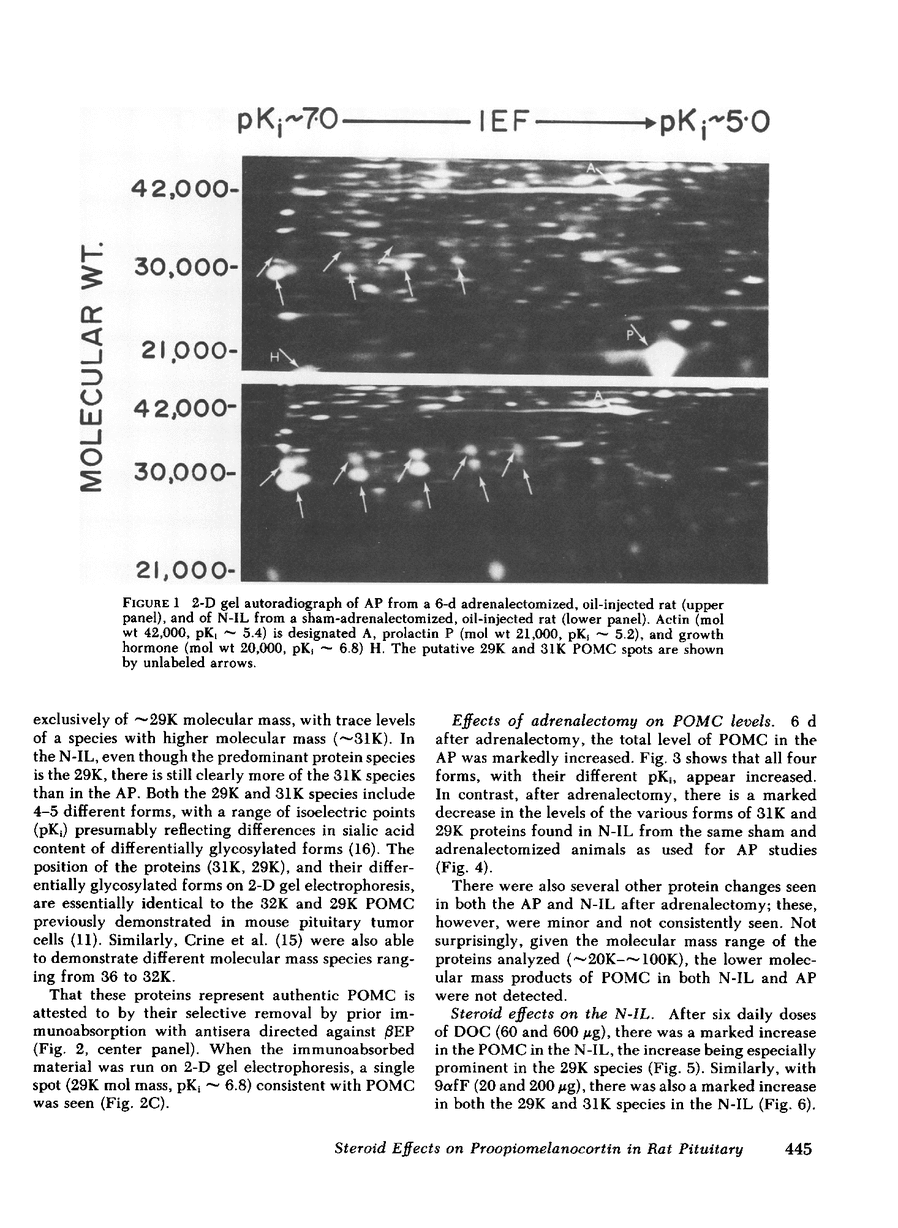 The effects of adrenal steroids on proopiomelanocortin (POMC) levels in rat pituitary have been studied by two-dimensional gel electrophoresis. In intact rats the relative abundance of POMC was much higher in the neurointermediate lobe (N-IL) than in anterior pituitary (AP); in both tissues the predominant species appeared to be of 29,000-dalton (29K) molecular mass, with lesser amounts of a 31K form. In both tissues, the 31K and 29K forms showed multiple spots, consistent with different degrees of sialoglycosylation. Adrenalectomy was followed by a marked increase in AP levels of POMC, and a marked decrease in N-IL levels. In adrenalectomized rats, dexamethasone administration did not affect N-IL levels of POMC, but suppressed 35S incorporation into POMC in AP in a dose-related manner; deoxycorticosterone showed minimal effects on AP levels of POMC, but progressively elevated N-IL levels; 9 alpha fluorocortisol (9 alpha fF) progressively both suppressed AP levels, and raised N-IL levels of POMC. Estimation of immunoreactive (ir) ACTH and ir-beta-endorphin in parallel samples showed an elevation of N-IL levels in response to mineralocorticoids (deoxycorticosterone, 9 alpha fF), and a paradoxical elevation of AP levels in response to glucocorticoids (dexamethasone, 9 alpha fF) compared with oil-injected adrenalectomized controls. We conclude (a) that glucocorticoids suppress the secretion of ir-ACTH and ir-beta-endorphin to a greater extent than they inhibit the synthesis of POMC; (b) that mineralocorticoids specifically elevate the N-IL levels of both POMC and its immunoreactive product (beta-endorphin).