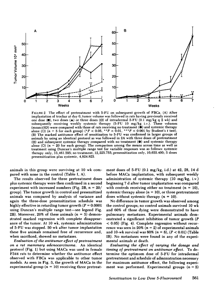 This report describes a novel method of immunochemotherapy; the active immunization to the drug 5-fluorouracil (5-FU) with enhanced antitumor activity resulting from its subsequent systemic administration. Two metastasizing carcinomas in the Fischer strain (F344) rat have been used: a chemically induced bladder carcinoma (FBCa) and a spontaneous mammary adenocarcinoma (MACa). Both tumors grow rapidly and result in 100% mortality within 10 wk of implantation. Neither tumor is sensitive to systemic 5-FU alone. Intradermal sensitization to 5-FU before FBCa tumor implantation, followed by 5-FU administered systemically, resulted in significant tumor regression and improvement in survival with eradication of all tumor and cure in 20% of animals. A similar antitumor effect was observed with the MACa. A comparable drug effect was observed when methotrexate sensitization was given before FBCa implantation followed by systemic MTX. Specificity to the sensitizing drug was demonstrated by the lack of effect of sensitization with either 5-FU or MTX unless followed by systemic therapy with the requisite sensitizing agent. Sensitization to 5-FU has also been assessed after FBCa implantation followed by resection of the local tumor. Resection was performed after distant tumor metastases had occurred, and was followed by systemic 5-FU therapy. Whereas tumor resection alone failed to cure any animal, sensitization to 5-FU increased cure rate fourfold over animals receiving systemic 5-FU alone. Antibody to 5-FU in the sera of sensitized animals has been suggested by an immunoenzymatic staining technique and its specificity confirmed in a radioimmunoassay. It is postulated that a combination of the systemic agent and the antibody elicited to it by sensitization produces the significant antitumor effect observed. The antitumor effect observed with this new approach to immunochemotherapy warrants further experimental and clinical study.