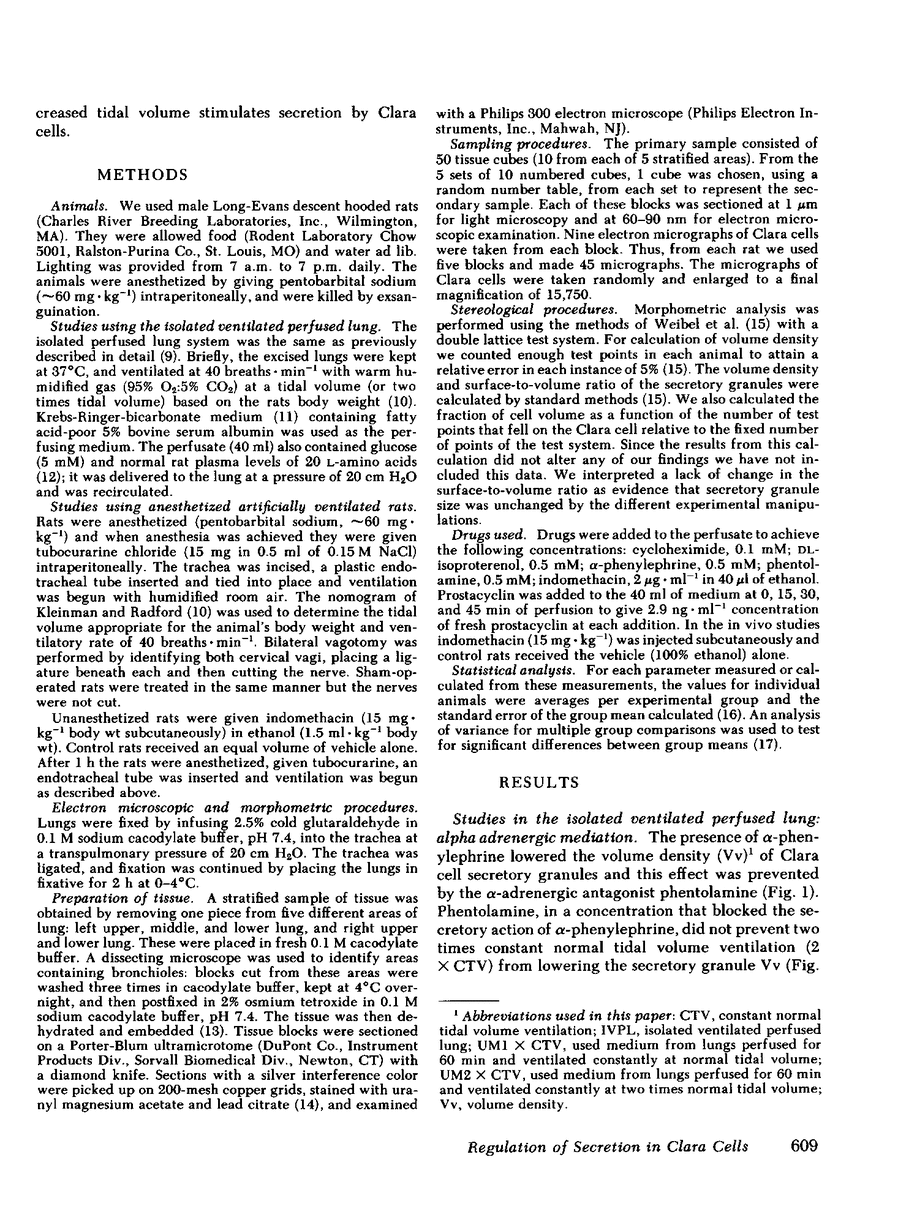 Using electron microscopy and morphometric methods to assess secretion, we previously found that two times tidal volume ventilation of isolated perfused rat lung stimulates secretion by bronchiolar Clara cells; this effect is not prevented by β-adrenergic blockade (J. Clin. Invest. 1981. 67: 345-351.). In this study we used the isolated perfused rat lung and the anesthetized mechanically ventilated rat, to further study the mechanism by which large tidal volumes stimulate secretion by Clara cells. With the perfused lung we found (a) α-adrenergic inhibition did not block the secretory effect of ventilation at two times normal tidal volume; (b) indomethacin completely blocked the secretory action of two times tidal volume ventilation; (c) medium previously used to perfuse lungs ventilated at two times tidal volume, but not medium previously used to ventilate lungs at normal tidal volume, stimulated secretion by Clara cells when used to perfuse fresh lungs ventilated at tidal volume; (d) addition of prostacyclin to the fresh perfusate increased secretion by Clara cells of lungs ventilated at normal tidal volume. In anesthetized mechanically ventilated rats, sighs stimulated secretion by Clara cells; this increased secretion was inhibited by indomethacin but not by cholinergic blockade (bilateral vagotomy). These studies indicate that increased volume ventilation stimulates secretion by Clara cells in vivo and in vitro; they provide evidence that chemical nonadrenergic, noncholinergic mechanisms are involved in this secretion, and that prostaglandins may be the chemical messenger coupling the mechanico-secretory events.