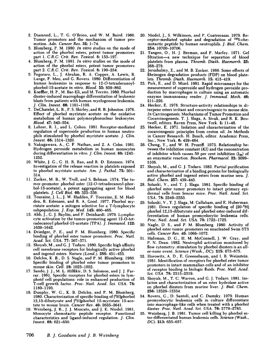 The tumor promoting phorbol diesters elicit a variety of responses from normal and leukemic blood cells in vitro by apparently interacting with cellular receptors. The biologically active ligand [20-3H] phorbol 12,13-dibutyrate ([3H]PDBu) bound specifically to intact human lymphocytes, monocytes, polymorphonuclear leukocytes (PMN), and platelets, but not to erythrocytes. Binding, which was comparable for all four blood cell types, occurred rapidly at 23° and 37°C, reaching a maximum by 20-30 min usually followed by a 30-40% decrease in cell associated radioactivity over the next 30-60 min. The time course for binding was temperature dependent with equilibrium binding occurring after 120-150 min at 4°C, with no subsequent loss of cell-associated radioactivity at this temperature. Bound [3H]PDBu could be eluted by addition of unlabeled PDBu. Scatchard analysis of data from 4°C binding studies revealed linear plots with high affinity receptors in these cell types with dissociation constants and receptors per cell of 60 nM and 7.8 × 105/cell for lymphocytes, 51 nM and 15.5 × 105/cell for monocytes, 38 nM and 4.0 × 105/cell for PMN, and 19 nM and 2.9 × 104/cell for platelets. Structure-activity studies using unlabeled phorbol-related compounds demonstrated a close correlation between their abilities to inhibit binding of [3H]PDBu to cells and their abilities to induce cellular responses (monocyte and PMN H2O2 secretion, lymphocyte 3HTdR incorporation, and platelet tritiated serotonin release); phorbol and 4-alpha phorbol were inactive while phorbol 12-myristate 13-acetate (PMA), PDBu, mezerein, and phorbol 12,13-diacetate (in decreasing order of potency) inhibited [3H]PDBu binding and elicited the various responses. Thus, these high affinity, specific receptors for the phorbol diesters, present on monocytes, lymphocytes, PMN, and platelets, mediate the pleiotypic effects induced by these ligands.