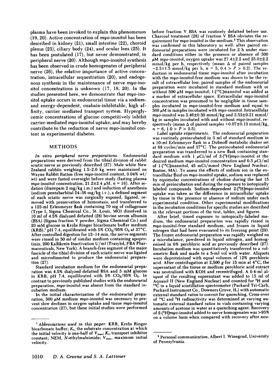 Experimental diabetes consistently reduces the concentration of free myo-inositol in peripheral nerve, which usually exceeds that of plasma by 90-100-fold. This phenomenon has been explicitly linked to the impairment of nerve conduction in the acutely diabetic streptozocin-treated rat. However, the mechanism by which acute experimental diabetes lowers nerve myo-inositol content and presumably alters nerve myo-inositol content and presumably alters nerve myo-inositol metabolism is unknown. Therefore, the effects of insulin and elevated medium glucose concentration of 2-[3H]myo-inositol uptake were studied in a metabolically-defined in vitro peripheral nerve tissue preparation derived from rabbit sciatic nerve, whose free myo-inositol content is reduced by experimental diabetes. The results demonstrate that myo-inositol uptake occurs by at least two distinct transport systems in the normal endoneurial preparation. A sodium- and energy-dependent saturable transport system is responsible for at least 94% of the measured uptake at medium myo-inositol concentrations approximating that present in plasma. This carrier-mediated transport system has a high affinity for myo-inositol (Kt = 63 microM), and is not influenced acutely by physiological concentrations of insulin; it is, however, inhibited by hyperglycemic concentrations of glucose added to the incubation medium in a primarily competitive fashion. Thus, competitive inhibition of peripheral nerve myo-inositol uptake by glucose may constitute a mechanism by which diabetes produces physiologically significant alterations in peripheral nerve myo-inositol metabolism.