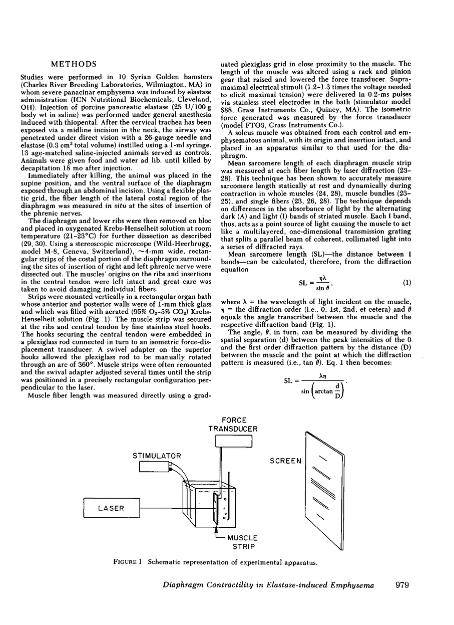 The effect of emphysema on the ability of the diaphragm to generate force was examined in costal diaphragm muscle strips from 10 Golden hamsters killed 18 mo after intratracheal injection of pancreatic elastase in a dose producing hyperinflation (mean total lung capacity [TLC] = 163% of control) and generalized panacinar emphysema. 13 saline-injected normal animals served as controls. The time course of isometric tension and the effect of alterations in muscle fiber and sarcomere length on the isometric tension (T) generated in response to tetanizing electrical stimuli (length-tension [L-T] relationship) were examined. Elastase administration caused an increase in diaphragm muscle thickness and reduction in the length of costal diaphragm muscle fibers measured in situ. Emphysema significantly increased the maximum tetanic tension as a result of hypertrophy. Maximal tension corrected for increases in muscle cross-sectional area (T/cm2), however, was the same in emphysematous (E) and control (C) animals. Emphysema also shifted the muscle fiber L-T curve of the diaphragm but not of a control muscle, the soleus, toward shorter lengths. In contrast to the effects of E on the diaphragm muscle fiber L-T curve, the sarcomere L-T curve was the same in E and C. Since the length at which tension was maximal correlated closely with sarcomere number (r = 0.94; P < 0.001) reduction in the number of sarcomeres in series in muscles from emphysematous animals appeared to explain the shift in the muscle fiber L-T curve. We conclude that in elastase-induced emphysema adaptive changes both in diaphragm cross-sectional area and sarcomere number augment the force-generating ability of the diaphragm. We speculate that changes in sarcomere number compensate for alterations in muscle fiber length resulting from chronic hyperinflation of the thorax, while diaphragmatic muscle hypertrophy represents a response to changes in respiratory load and/or diaphragm configuration (LaPlace relationship).