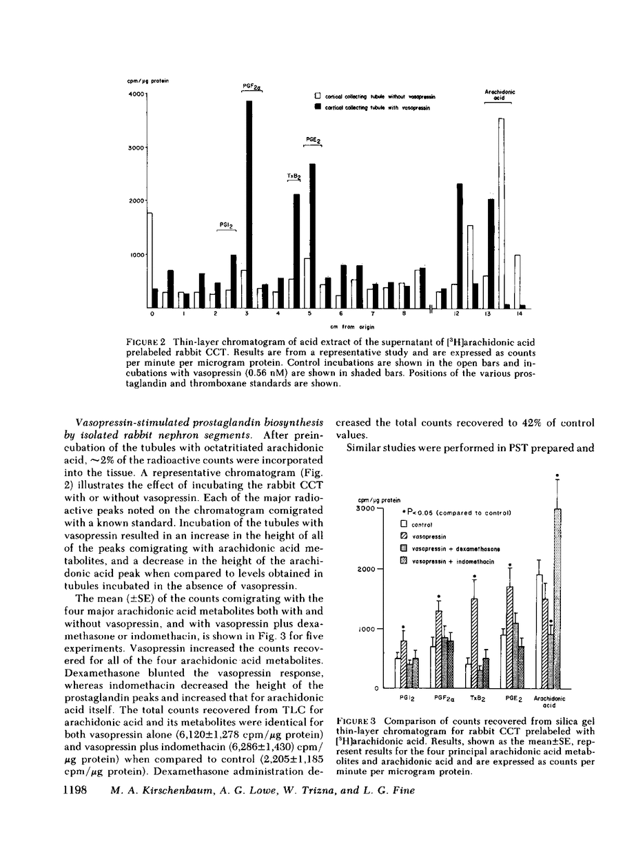The present studies examined whether vasopressin increases prostaglandin biosynthesis in isolated rabbit cortical collecting tubules (CCT) and whether endogenous prostaglandin biosynthesis plays a role in modulating the response of this nephron segment to vasopressin. Three groups of studies were performed. In the first group, CCT and proximal straight tubules (PST) were incubated with [3H]arachidonic acid, and metabolites were separated and identified using silica gel thin-layer chromatography. CCT were capable of producing all of the major prostaglandins (PG) (PGE2 > thromboxane B2[TxB2] > PGF2α > PGI2). PST produced significantly lesser quantities of these lipids. In the second group, radiolabeled arachidonic acid was incorporated into the phospholipid pool of both CCT and PST, vasopressin was added to the incubation medium, and metabolities were separated and identified as above. Vasopressin stimulated the release of all of the major prostaglandins in CCT but had no effect on PST. PGE release into the incubation medium, as assessed by a radioreceptor assay, increased 108%, and a vasopressin analogue, 1-desamino-8-d-arginine vasopressin, had a quantitatively similar effect. In the third group, a submaximal dose of vasopressin was administered to isolated, perfused CCT studied in the presence and absence of indomethacin to assess whether endogenous prostaglandins play a role in modulating the antidiuretic response to vasopressin. Studies were performed in rabbits on a normal diet and in desoxycorticosterone acetate (DOCA)- or KCl-loaded animals. In the state of mineralocorticoid excess, basal prostaglandin synthesis was 63% lower, and vasopressin-stimulated prostaglandin synthesis 76% lower, than the synthesis observed in rabbits on a normal diet. Cyclooxygenase inhibition exposed a significant hydroosmotic response to a submaximal dose of vasopressin in CCT from DOCA- or KCl-loaded animals. With arachidonic acid in the bath, the same dose of vasopressin failed to elicit a hydroosmotic response in CCT from rabbits on a normal diet even in the presence of a cyclooxygenase inhibitor. However, removal of exogenous arachidonic acid, with a consequently lower rate of prostaglandin synthesis, allowed the cyclooxygenase inhibitor to enhance the hydroosmotic response to vasopressin in these tubules.