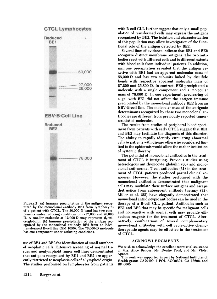 Two murine monoclonal antibodies (BE1 and BE2), produced by using leukemic helper T cells from a patient with cutaneous T-cell lymphoma (CTCL) as immunogens, reacted selectively with CTCL lymphocytes and some transformed cultured lymphocytes, as determined by radioimmunoassay (RIA) and indirect immunofluorescence (IIF). BE1 reacted significantly (P less than or equal to 0.001) with leukemic CTCL lymphocytes and with CTCL cells from infiltrated lymph nodes (RIA, mean +/- SD = 776 +/- 275 cpm), as compared with background counts (263 +/- 68). BE1 binding to normal blood mononuclear cells (RIA, mean +/- SD = 283 +/- 58 cpm) was indistinguishable from background. BE1 also reacted with Epstein-Barr virus (EBV)-transformed B-cell lines (RIA, mean +/- SD = 794 +/- 230) and some long-term T-cell lines. BE1 did not react with the majority of lymphoid cell lines or tumor cell lines tested. BE1 also did not react with any normal tissues screened by IIF. BE1 precipitated a molecule from CTCL cells that, under reducing conditions, has two components with molecular mass of 27,200 and 25,800 D. BE2 also reacted significantly (P less than or equal to 0.001) with CTCL cells from two of four patients (RIA, mean +/- SD = 519 +/- 113 cpm). The binding of BE2 to normal mononuclear cells was indistinguishable from background (309 +/- 38 cpm). BE2 also reacted with an antigen present on EBV-B-cell lines (RIA, mean +/- SD = 654 +/- 194) and MOLT 3 and HUT 78 T-cell lines. BE2 reacted with an antigen expressed on a subpopulation of lymphocytes from five of eight patients with B-cell CLL studied by IIF (mean +/- SD = 18 +/- 6). Other long-term T-cell lines and tumor cell lines studied by IIF were unreactive with BE2. BE2 did not react with any of the normal tissues studied. BE2 precipitated a molecule (78,000 D) from CTCL cells and EBV-B cells with a single component under reducing conditions. Immunoperoxidase-labeled BE1 and BE2 reacted with CTCL cells in frozen sections of infiltrated lymph nodes and skin. In addition, BE1 and BE2 reacted with blood lymphocytes from 16 of 21 patients whose CTCL had otherwise been considered localized to skin. These two monoclonal antibodies react with tumor antigens associated with CTCL and appear to be useful in the diagnosis of this disorder.