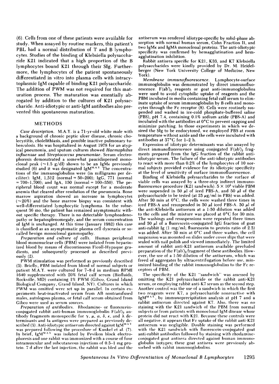 Recently we have identified two monoclonal immunoglobulin M (IgM) proteins that bind Klebsiella polysaccharides. The lymphocytes of one of these patients (M.A.Y.) were available for study. A substantial proportion of the B lymphocytes isolated from this patient's peripheral blood also bound Klebsiella polysaccharides with a pattern of specificity identical to that of the monoclonal IgM, and reacted with an anti-idiotypic antiserum directed against this IgM. Stripping the surface immunoglobulin from these lymphocytes eliminated this reactivity. Although no plasma cells were detected in the freshly isolated peripheral blood lymphocytes of this patient, plasma cells binding Klebsiella polysaccharide appeared after 7 d of in vitro culture. This occurred regardless of whether the cultures were supplemented with autologous plasma, normal human plasma, or fetal calf serum. Pokeweed mitogen neither stimulated nor inhibited the in vitro differentiation of the monoclonal B lymphocytes into plasma cells. This differentiation was, however, abrogated by F(ab')2 fragments of anti-human IgM and by anti-idiotypic antibodies, as well as by the Klebsiella polysaccharide with which the monoclonal IgM reacted.