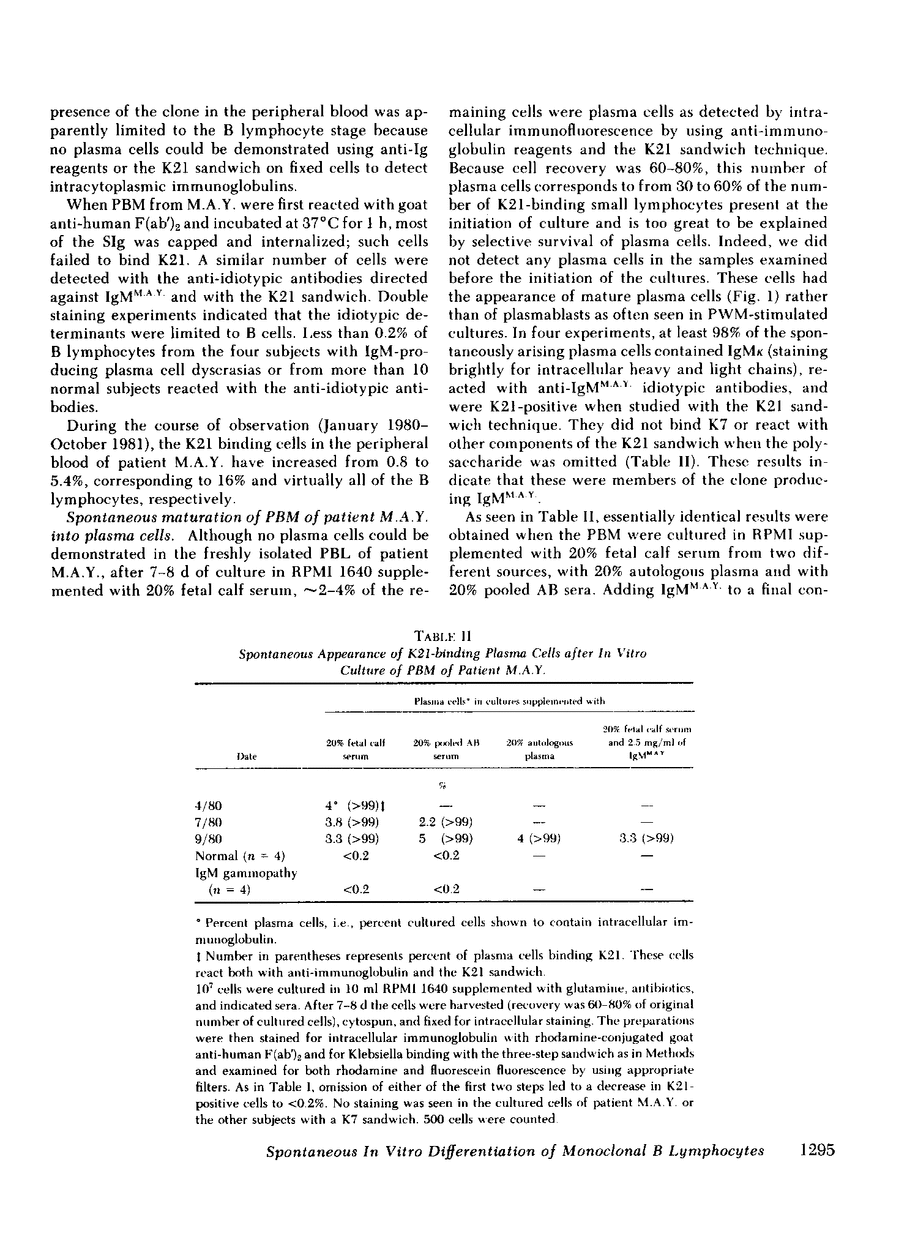 Recently we have identified two monoclonal immunoglobulin M (IgM) proteins that bind Klebsiella polysaccharides. The lymphocytes of one of these patients (M.A.Y.) were available for study. A substantial proportion of the B lymphocytes isolated from this patient's peripheral blood also bound Klebsiella polysaccharides with a pattern of specificity identical to that of the monoclonal IgM, and reacted with an anti-idiotypic antiserum directed against this IgM. Stripping the surface immunoglobulin from these lymphocytes eliminated this reactivity. Although no plasma cells were detected in the freshly isolated peripheral blood lymphocytes of this patient, plasma cells binding Klebsiella polysaccharide appeared after 7 d of in vitro culture. This occurred regardless of whether the cultures were supplemented with autologous plasma, normal human plasma, or fetal calf serum. Pokeweed mitogen neither stimulated nor inhibited the in vitro differentiation of the monoclonal B lymphocytes into plasma cells. This differentiation was, however, abrogated by F(ab')2 fragments of anti-human IgM and by anti-idiotypic antibodies, as well as by the Klebsiella polysaccharide with which the monoclonal IgM reacted.