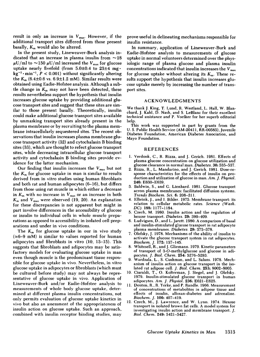 The present studies were undertaken to assess the mechanism by which insulin increases glucose uptake in man. Because glucose uptake in most mammalian tissues occurs predominantly by a facilitated transport system that follows Michaelis-Menten kinetics, glucose uptake was measured isotopically in normal volunteers over the physiologic range of plasma glucose and insulin concentrations and was subjected to Lineweaver-Burk and Eadie-Hofstee analysis. With both methods, increases in plasma insulin from 18 microunits/ml to 80 and 150 microunits/ml were found to increase the maximum velocity (Vmax) for glucose uptake nearly three- and fivefold, respectively, (P less than 0.025 and P less than 0.001) without significantly altering the Michaelis constant (Km). Because an increase in the affinity or molecular activity of transport sites or provision of additional transport sites that differed from those present basally should have altered the Km, whereas a mere increase in the number of transport sites would have only increased the Vmax, our results indicate that in man, insulin may increase glucose uptake merely by providing additional transport sites.