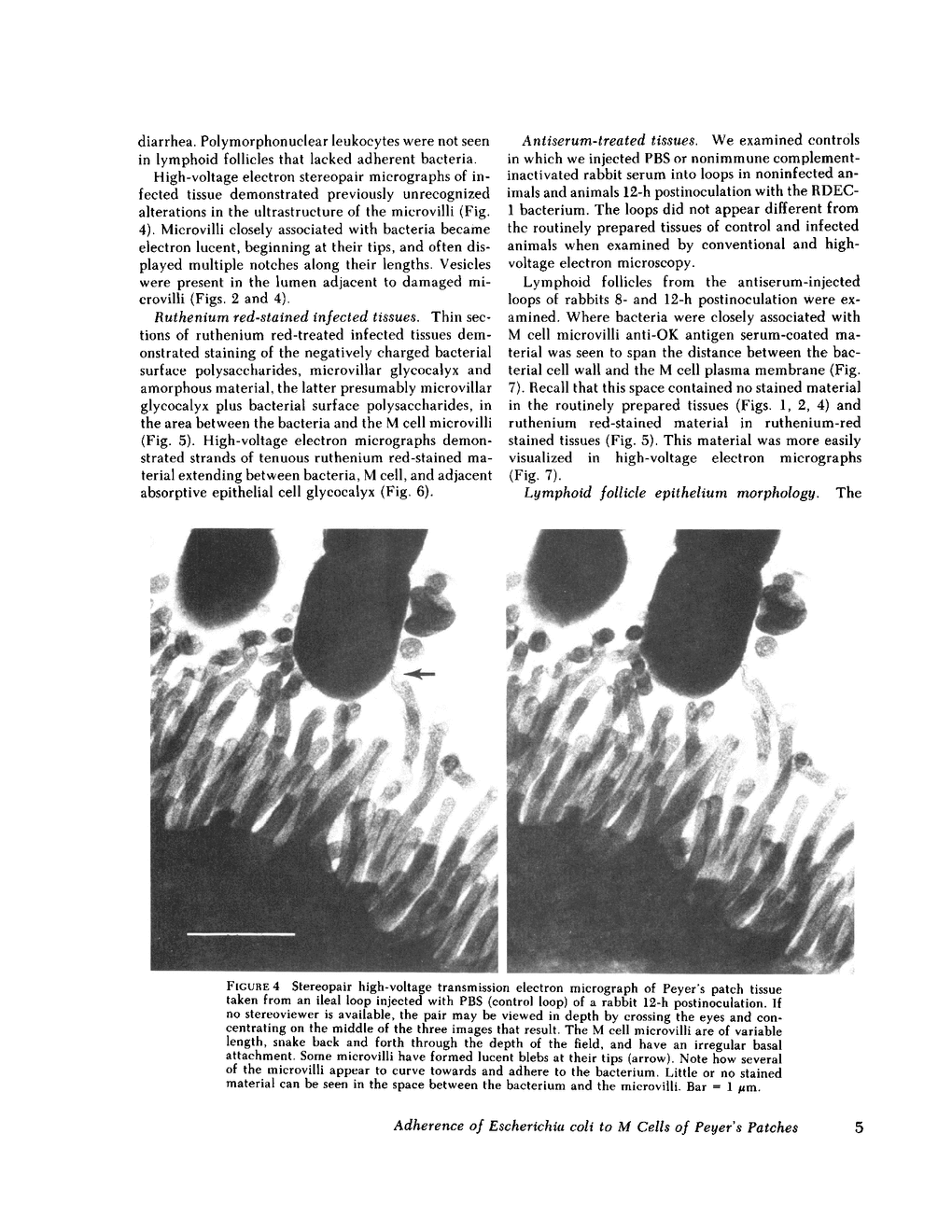 The RDEC-1 strain Escherichia coli is an enteroadherent bacterium that produces diarrhea in the rabbit. A histopathologically similar disease has been described in humans. The RDEC-1 bacterium adheres to the epithelium of lymphoid follicles in rabbit ileal Peyer's patches by 4 h postinoculation, 3-4 d before its adherence to absorptive epithelium. The purpose of this study was to determine whether the RDEC-1 bacterium adheres to a specific cell type in the lymphoid follicle epithelium. RDEC-1 bacteria were given in a dose of 2 X 10(6) by the orogastric route to postweanling rabbits. The distal ileal Peyer's patch, taken from 5 control rabbits and 43 rabbits at intervals in the first 24 h postinoculation, was examined by routine and high-voltage electron microscopy. The RDEC-1 bacterium adhered specifically to M (membranous) rather than absorptive epithelial cells of the lymphoid follicle epithelium. Further understanding of how the bacterium attaches to M cells, which transport antigens to intraepithelial lymphocytes, could be useful in designing vaccines to protect mucosal surfaces.