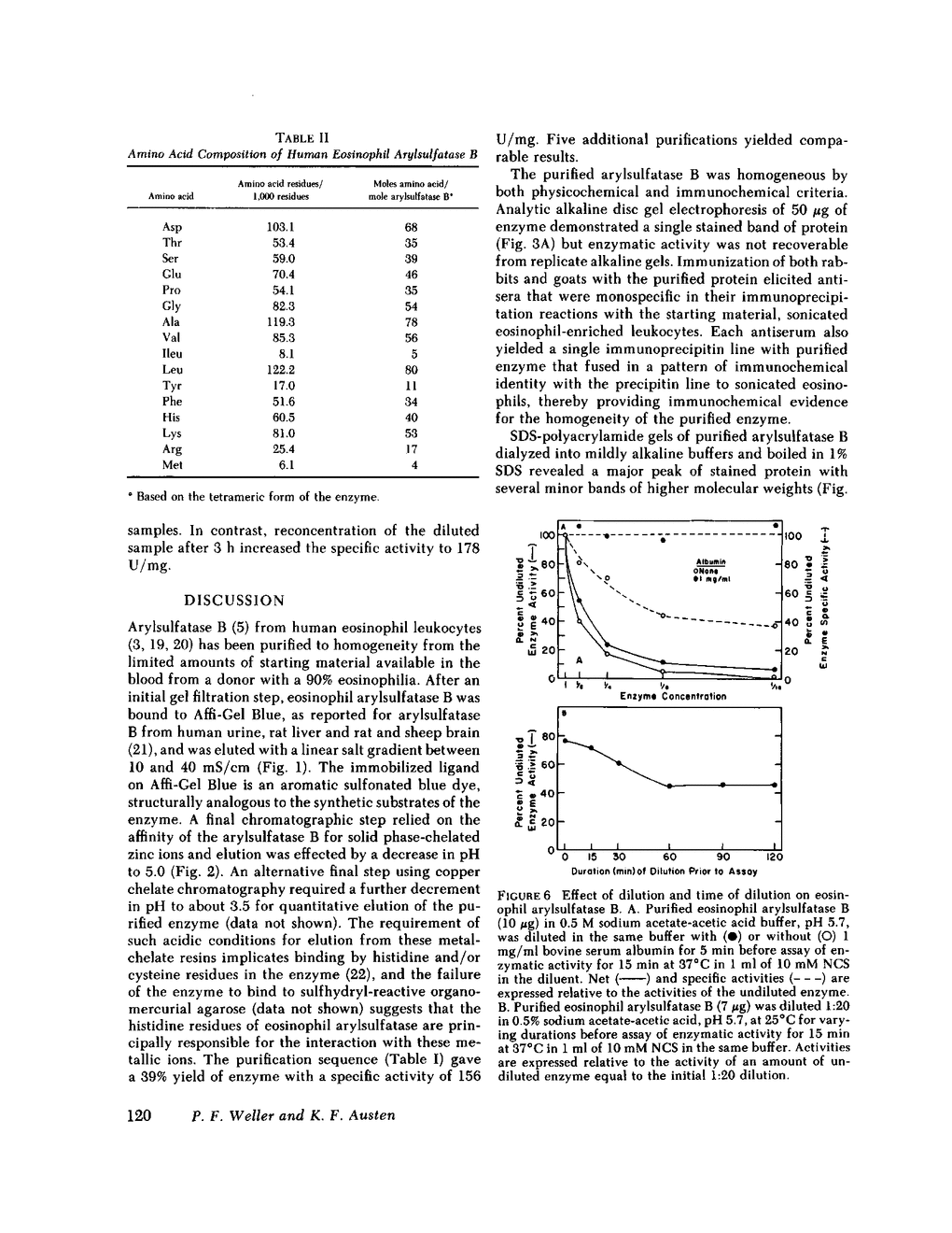 Arylsulfatase B from human eosinophils was purified free of contaminating proteins by gel filtration and sequential affinity chromatography on Affi-Gel Blue and zinc chelate Sepharose. 50 micrograms of the purified enzyme presented as a single stained band on alkaline disc gel electrophoresis. In both goats and rabbits, the purified enzyme elicited monospecific antisera that yielded single precipitation arcs on Ouchterlony analysis with a human eosinophil extract and the purified enzyme; the immunoprecipitation lines fused in a pattern of identity, providing immunochemical evidence for the homogeneity of the purified enzyme. On sodium dodecyl sulfate (SDS)-polyacrylamide gel electrophoresis, a dominant lower molecular weight protein and three other bands with molecular weights approximately two, three, and four times that of the major protein band were resolved. The prominence of the less rapidly migrating protein bands increased relative to the major band if the enzyme was maintained under acidic conditions or was reacted with the cross-linking agent dimethyl suberimidate under alkaline conditions before SDS-polyacrylamide gel electrophoresis, supporting the conclusion that the enzyme consists of four subunits. Two stained bands were present on acid disc gel electrophoresis; they were composed of oligomeric forms of enzyme on analysis by SDS-polyacrylamide gel electrophoresis in a second dimension. A minimum molecular weight of 70,190 was determined from amino acid composition analysis for the tetrameric form of the enzyme. The specific functional activity of the purified arylsulfatase B was concentration and time dependent, compatible with its association or dissociation into subunit forms with differing specific activities. Factors that govern subunit interactions of arylsulfatase B, including local enzyme concentration and pH, provide mechanisms for regulating the enzymatic activity of this lysosomal hydrolase.