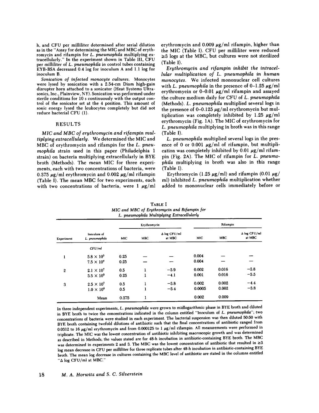 We have previously reported that virulent egg yolk-grown Legionella pneumophila, Philadelphia 1 strain, multiplies intracellularly in human blood monocytes and only intracellularly under tissue culture conditions. In this paper, we have investigated the effect of erythromycin and rifampin on L. pneumophila-monocyte interaction in vitro; erythromycin and rifampin are currently the drugs of choice for the treatment of Legionnaires' disease. The intracellular multiplication of L. pneumophila is inhibited by erythromycin and rifampin, as measured by colony-forming units, whether the antibiotics are added just before or just after infection of monocytes with L. pneumophila, or 2 d after infection when L. pneumophila is in the logarithmic phase of growth in monocytes. Intracellular multiplication of L. pneumophila is inhibited by 1.25 microgram/ml but not less than or equal to 0.125 microgram/ml erythromycin and 0.01 microgram/ml but not less than or equal to 0.001 microgram/ml rifampin. These concentrations of antibiotics are comparable to those that inhibit extracellular multiplication of L. pneumophila under cell-free conditions in artificial medium; the minimal inhibitory concentration is 0.37 microgram/ml for erythromycin and 0.002 microgram/ml for rifampin. Multiplication of L. pneumophila in the logarithmic phase of growth in monocytes is inhibited within 1 h of the addition of antibiotics. Intracellular bacteria inhibited from multiplying by antibiotics are not killed. By electron microscopy, the bacteria appear intact within membrane-bound vacuoles, studded with ribosomelike structures. L. pneumophila multiplying extracellularly on artificial medium is killed readily by relatively low concentrations of erythromycin and rifampin; the minimal bactericidal concentration is 1 microgram/ml for erythromycin and 0.009 microgram/ml for rifampin. In contrast, L. pneumophila multiplying intracellularly is resistant to killing by these concentrations of erythromycin and rifampin or by concentrations equal to or greater than peak serum levels in humans. Extracellular L. pneumophila in stationary phase is also resistant to killing by erythromycin and rifampin. These findings, taken together with our previous work, indicate that, in vivo, L. pneumophila is resistant to killing by erythromycin and rifampin. Inhibition of L. pneumophila multiplication in monocytes by antibiotics is reversible; when the antibiotics are removed from infected monocyte cultures after 2 d, L. pneumophila resumes multiplication. This study indicates that patients with Legionnaires' disease under treatment with erythromycin and rifampin require host defenses to eliminate L. pneumophila, and that inadequate host defenses may result in relapse after cessation of therapy.