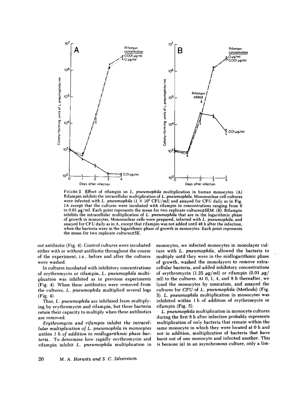 We have previously reported that virulent egg yolk-grown Legionella pneumophila, Philadelphia 1 strain, multiplies intracellularly in human blood monocytes and only intracellularly under tissue culture conditions. In this paper, we have investigated the effect of erythromycin and rifampin on L. pneumophila-monocyte interaction in vitro; erythromycin and rifampin are currently the drugs of choice for the treatment of Legionnaires' disease. The intracellular multiplication of L. pneumophila is inhibited by erythromycin and rifampin, as measured by colony-forming units, whether the antibiotics are added just before or just after infection of monocytes with L. pneumophila, or 2 d after infection when L. pneumophila is in the logarithmic phase of growth in monocytes. Intracellular multiplication of L. pneumophila is inhibited by 1.25 microgram/ml but not less than or equal to 0.125 microgram/ml erythromycin and 0.01 microgram/ml but not less than or equal to 0.001 microgram/ml rifampin. These concentrations of antibiotics are comparable to those that inhibit extracellular multiplication of L. pneumophila under cell-free conditions in artificial medium; the minimal inhibitory concentration is 0.37 microgram/ml for erythromycin and 0.002 microgram/ml for rifampin. Multiplication of L. pneumophila in the logarithmic phase of growth in monocytes is inhibited within 1 h of the addition of antibiotics. Intracellular bacteria inhibited from multiplying by antibiotics are not killed. By electron microscopy, the bacteria appear intact within membrane-bound vacuoles, studded with ribosomelike structures. L. pneumophila multiplying extracellularly on artificial medium is killed readily by relatively low concentrations of erythromycin and rifampin; the minimal bactericidal concentration is 1 microgram/ml for erythromycin and 0.009 microgram/ml for rifampin. In contrast, L. pneumophila multiplying intracellularly is resistant to killing by these concentrations of erythromycin and rifampin or by concentrations equal to or greater than peak serum levels in humans. Extracellular L. pneumophila in stationary phase is also resistant to killing by erythromycin and rifampin. These findings, taken together with our previous work, indicate that, in vivo, L. pneumophila is resistant to killing by erythromycin and rifampin. Inhibition of L. pneumophila multiplication in monocytes by antibiotics is reversible; when the antibiotics are removed from infected monocyte cultures after 2 d, L. pneumophila resumes multiplication. This study indicates that patients with Legionnaires' disease under treatment with erythromycin and rifampin require host defenses to eliminate L. pneumophila, and that inadequate host defenses may result in relapse after cessation of therapy.