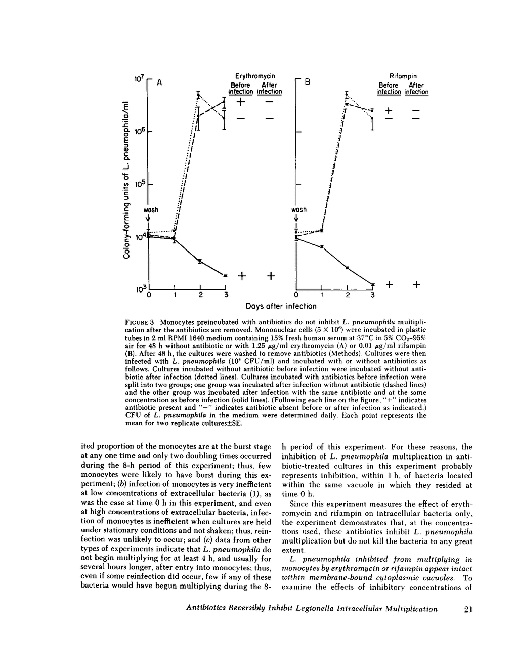 We have previously reported that virulent egg yolk-grown Legionella pneumophila, Philadelphia 1 strain, multiplies intracellularly in human blood monocytes and only intracellularly under tissue culture conditions. In this paper, we have investigated the effect of erythromycin and rifampin on L. pneumophila-monocyte interaction in vitro; erythromycin and rifampin are currently the drugs of choice for the treatment of Legionnaires' disease. The intracellular multiplication of L. pneumophila is inhibited by erythromycin and rifampin, as measured by colony-forming units, whether the antibiotics are added just before or just after infection of monocytes with L. pneumophila, or 2 d after infection when L. pneumophila is in the logarithmic phase of growth in monocytes. Intracellular multiplication of L. pneumophila is inhibited by 1.25 microgram/ml but not less than or equal to 0.125 microgram/ml erythromycin and 0.01 microgram/ml but not less than or equal to 0.001 microgram/ml rifampin. These concentrations of antibiotics are comparable to those that inhibit extracellular multiplication of L. pneumophila under cell-free conditions in artificial medium; the minimal inhibitory concentration is 0.37 microgram/ml for erythromycin and 0.002 microgram/ml for rifampin. Multiplication of L. pneumophila in the logarithmic phase of growth in monocytes is inhibited within 1 h of the addition of antibiotics. Intracellular bacteria inhibited from multiplying by antibiotics are not killed. By electron microscopy, the bacteria appear intact within membrane-bound vacuoles, studded with ribosomelike structures. L. pneumophila multiplying extracellularly on artificial medium is killed readily by relatively low concentrations of erythromycin and rifampin; the minimal bactericidal concentration is 1 microgram/ml for erythromycin and 0.009 microgram/ml for rifampin. In contrast, L. pneumophila multiplying intracellularly is resistant to killing by these concentrations of erythromycin and rifampin or by concentrations equal to or greater than peak serum levels in humans. Extracellular L. pneumophila in stationary phase is also resistant to killing by erythromycin and rifampin. These findings, taken together with our previous work, indicate that, in vivo, L. pneumophila is resistant to killing by erythromycin and rifampin. Inhibition of L. pneumophila multiplication in monocytes by antibiotics is reversible; when the antibiotics are removed from infected monocyte cultures after 2 d, L. pneumophila resumes multiplication. This study indicates that patients with Legionnaires' disease under treatment with erythromycin and rifampin require host defenses to eliminate L. pneumophila, and that inadequate host defenses may result in relapse after cessation of therapy.
