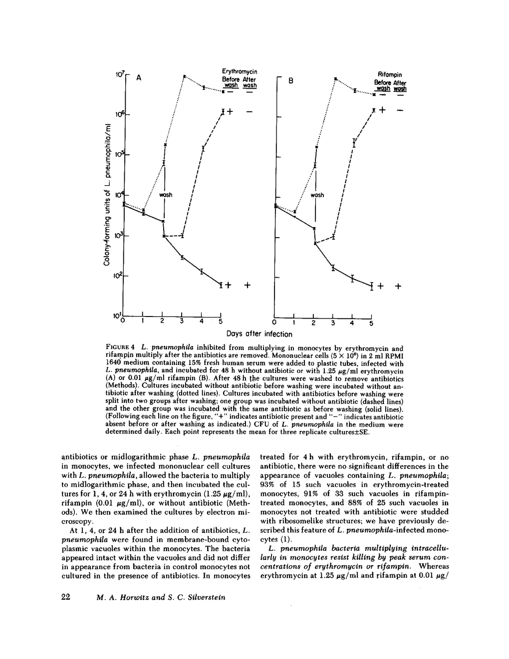 We have previously reported that virulent egg yolk-grown Legionella pneumophila, Philadelphia 1 strain, multiplies intracellularly in human blood monocytes and only intracellularly under tissue culture conditions. In this paper, we have investigated the effect of erythromycin and rifampin on L. pneumophila-monocyte interaction in vitro; erythromycin and rifampin are currently the drugs of choice for the treatment of Legionnaires' disease. The intracellular multiplication of L. pneumophila is inhibited by erythromycin and rifampin, as measured by colony-forming units, whether the antibiotics are added just before or just after infection of monocytes with L. pneumophila, or 2 d after infection when L. pneumophila is in the logarithmic phase of growth in monocytes. Intracellular multiplication of L. pneumophila is inhibited by 1.25 microgram/ml but not less than or equal to 0.125 microgram/ml erythromycin and 0.01 microgram/ml but not less than or equal to 0.001 microgram/ml rifampin. These concentrations of antibiotics are comparable to those that inhibit extracellular multiplication of L. pneumophila under cell-free conditions in artificial medium; the minimal inhibitory concentration is 0.37 microgram/ml for erythromycin and 0.002 microgram/ml for rifampin. Multiplication of L. pneumophila in the logarithmic phase of growth in monocytes is inhibited within 1 h of the addition of antibiotics. Intracellular bacteria inhibited from multiplying by antibiotics are not killed. By electron microscopy, the bacteria appear intact within membrane-bound vacuoles, studded with ribosomelike structures. L. pneumophila multiplying extracellularly on artificial medium is killed readily by relatively low concentrations of erythromycin and rifampin; the minimal bactericidal concentration is 1 microgram/ml for erythromycin and 0.009 microgram/ml for rifampin. In contrast, L. pneumophila multiplying intracellularly is resistant to killing by these concentrations of erythromycin and rifampin or by concentrations equal to or greater than peak serum levels in humans. Extracellular L. pneumophila in stationary phase is also resistant to killing by erythromycin and rifampin. These findings, taken together with our previous work, indicate that, in vivo, L. pneumophila is resistant to killing by erythromycin and rifampin. Inhibition of L. pneumophila multiplication in monocytes by antibiotics is reversible; when the antibiotics are removed from infected monocyte cultures after 2 d, L. pneumophila resumes multiplication. This study indicates that patients with Legionnaires' disease under treatment with erythromycin and rifampin require host defenses to eliminate L. pneumophila, and that inadequate host defenses may result in relapse after cessation of therapy.