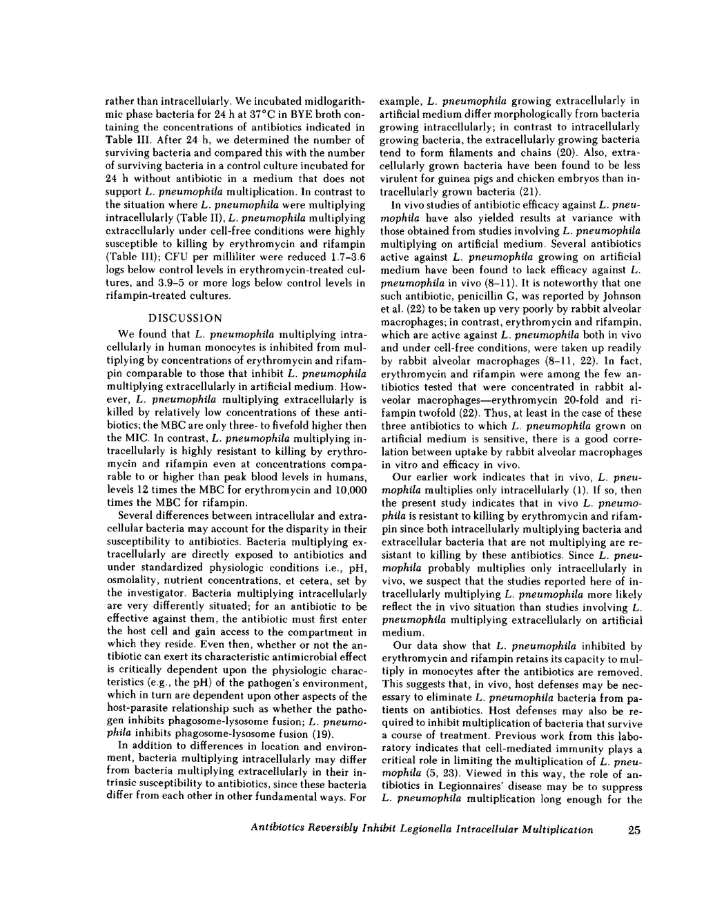 We have previously reported that virulent egg yolk-grown Legionella pneumophila, Philadelphia 1 strain, multiplies intracellularly in human blood monocytes and only intracellularly under tissue culture conditions. In this paper, we have investigated the effect of erythromycin and rifampin on L. pneumophila-monocyte interaction in vitro; erythromycin and rifampin are currently the drugs of choice for the treatment of Legionnaires' disease. The intracellular multiplication of L. pneumophila is inhibited by erythromycin and rifampin, as measured by colony-forming units, whether the antibiotics are added just before or just after infection of monocytes with L. pneumophila, or 2 d after infection when L. pneumophila is in the logarithmic phase of growth in monocytes. Intracellular multiplication of L. pneumophila is inhibited by 1.25 microgram/ml but not less than or equal to 0.125 microgram/ml erythromycin and 0.01 microgram/ml but not less than or equal to 0.001 microgram/ml rifampin. These concentrations of antibiotics are comparable to those that inhibit extracellular multiplication of L. pneumophila under cell-free conditions in artificial medium; the minimal inhibitory concentration is 0.37 microgram/ml for erythromycin and 0.002 microgram/ml for rifampin. Multiplication of L. pneumophila in the logarithmic phase of growth in monocytes is inhibited within 1 h of the addition of antibiotics. Intracellular bacteria inhibited from multiplying by antibiotics are not killed. By electron microscopy, the bacteria appear intact within membrane-bound vacuoles, studded with ribosomelike structures. L. pneumophila multiplying extracellularly on artificial medium is killed readily by relatively low concentrations of erythromycin and rifampin; the minimal bactericidal concentration is 1 microgram/ml for erythromycin and 0.009 microgram/ml for rifampin. In contrast, L. pneumophila multiplying intracellularly is resistant to killing by these concentrations of erythromycin and rifampin or by concentrations equal to or greater than peak serum levels in humans. Extracellular L. pneumophila in stationary phase is also resistant to killing by erythromycin and rifampin. These findings, taken together with our previous work, indicate that, in vivo, L. pneumophila is resistant to killing by erythromycin and rifampin. Inhibition of L. pneumophila multiplication in monocytes by antibiotics is reversible; when the antibiotics are removed from infected monocyte cultures after 2 d, L. pneumophila resumes multiplication. This study indicates that patients with Legionnaires' disease under treatment with erythromycin and rifampin require host defenses to eliminate L. pneumophila, and that inadequate host defenses may result in relapse after cessation of therapy.