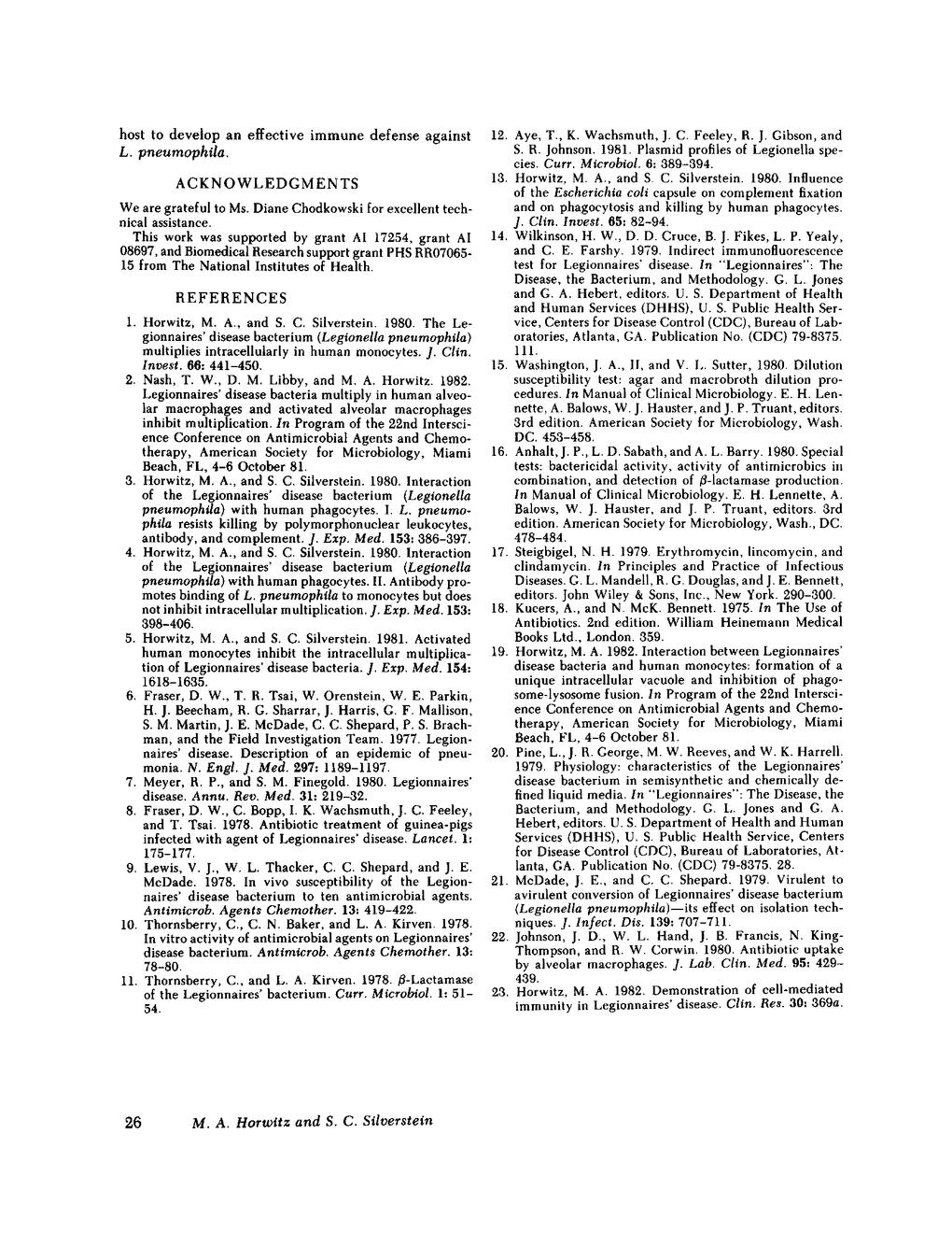 We have previously reported that virulent egg yolk-grown Legionella pneumophila, Philadelphia 1 strain, multiplies intracellularly in human blood monocytes and only intracellularly under tissue culture conditions. In this paper, we have investigated the effect of erythromycin and rifampin on L. pneumophila-monocyte interaction in vitro; erythromycin and rifampin are currently the drugs of choice for the treatment of Legionnaires' disease. The intracellular multiplication of L. pneumophila is inhibited by erythromycin and rifampin, as measured by colony-forming units, whether the antibiotics are added just before or just after infection of monocytes with L. pneumophila, or 2 d after infection when L. pneumophila is in the logarithmic phase of growth in monocytes. Intracellular multiplication of L. pneumophila is inhibited by 1.25 microgram/ml but not less than or equal to 0.125 microgram/ml erythromycin and 0.01 microgram/ml but not less than or equal to 0.001 microgram/ml rifampin. These concentrations of antibiotics are comparable to those that inhibit extracellular multiplication of L. pneumophila under cell-free conditions in artificial medium; the minimal inhibitory concentration is 0.37 microgram/ml for erythromycin and 0.002 microgram/ml for rifampin. Multiplication of L. pneumophila in the logarithmic phase of growth in monocytes is inhibited within 1 h of the addition of antibiotics. Intracellular bacteria inhibited from multiplying by antibiotics are not killed. By electron microscopy, the bacteria appear intact within membrane-bound vacuoles, studded with ribosomelike structures. L. pneumophila multiplying extracellularly on artificial medium is killed readily by relatively low concentrations of erythromycin and rifampin; the minimal bactericidal concentration is 1 microgram/ml for erythromycin and 0.009 microgram/ml for rifampin. In contrast, L. pneumophila multiplying intracellularly is resistant to killing by these concentrations of erythromycin and rifampin or by concentrations equal to or greater than peak serum levels in humans. Extracellular L. pneumophila in stationary phase is also resistant to killing by erythromycin and rifampin. These findings, taken together with our previous work, indicate that, in vivo, L. pneumophila is resistant to killing by erythromycin and rifampin. Inhibition of L. pneumophila multiplication in monocytes by antibiotics is reversible; when the antibiotics are removed from infected monocyte cultures after 2 d, L. pneumophila resumes multiplication. This study indicates that patients with Legionnaires' disease under treatment with erythromycin and rifampin require host defenses to eliminate L. pneumophila, and that inadequate host defenses may result in relapse after cessation of therapy.