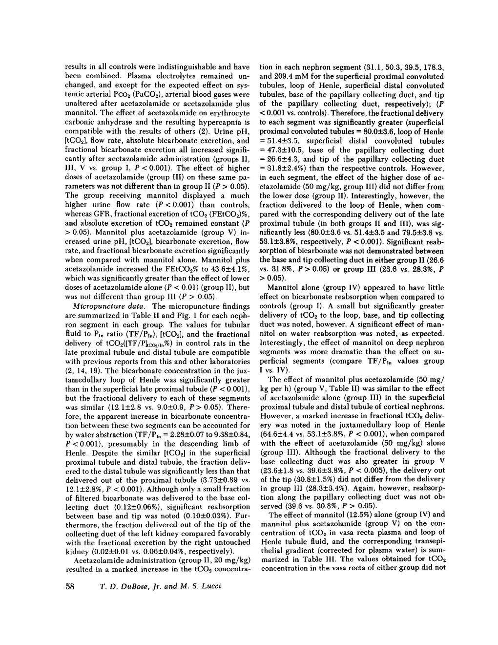 The nephron segment responsible for the acetazolamide-insensitive fraction of renal bicarbonate reabsorption has not been clearly delineated. This study compares superficial and deep nephron bicarbonate reabsorption before and after acetazolamide at two dose levels (20 and 50 mg/kg per h) in mutant Munich-Wistar rats employing both cortical and papillary micropuncture and microcalorimetry. Systemic acid-base balance and right whole kidney glomerular filtration rate were similar in all groups examined. The effects of the two doses of acetazolamide were indistinguishable and resulted in a significant increase in whole kidney bicarbonate excretion that compared favorably with the fraction delivered out of the left papillary tip. Acetazolamide inhibited superficial proximal bicarbonate reabsorption by 80.0%, whereas reabsorption up to the deep loop of Henle was decreased by only 52% (P less than 0.001). Bicarbonate reabsorption that was insensitive to acetazolamide occurred in the superficial and deep loop of Henle and between the distal tubule and base collecting duct. Because water reabsorption in these segments could serve to generate transepithelial bicarbonate concentration gradients favorable for reabsorption, we attempted to minimize water abstraction by combined administration of mannitol and acetazolamide. During this condition a significant increase in bicarbonate delivery up to the deep loop of Henle was noted (52 vs. 65%), whereas superficial nephron reabsorption was not altered. Furthermore, an outwardly directed bicarbonate concentration gradient from the deep loop of Henle to vasa recta was demonstrated during acetazolamide (delta tCO2 = 20.9 +/- 3.3 mM), but was abolished during combined mannitol and acetazolamide administration (delta tCO2 = 3.5 +/- 0.9 mM). It is concluded that carbonic anhydrase inhibition results in a disparate effect on nephron bicarbonate reabsorption when juxtamedullary and superficial nephron segments are compared. Our findings suggest that a mechanism for residual bicarbonate reabsorption during acetazolamide administration may be passive reabsorption driven by favorable transepithelial concentration gradients.
