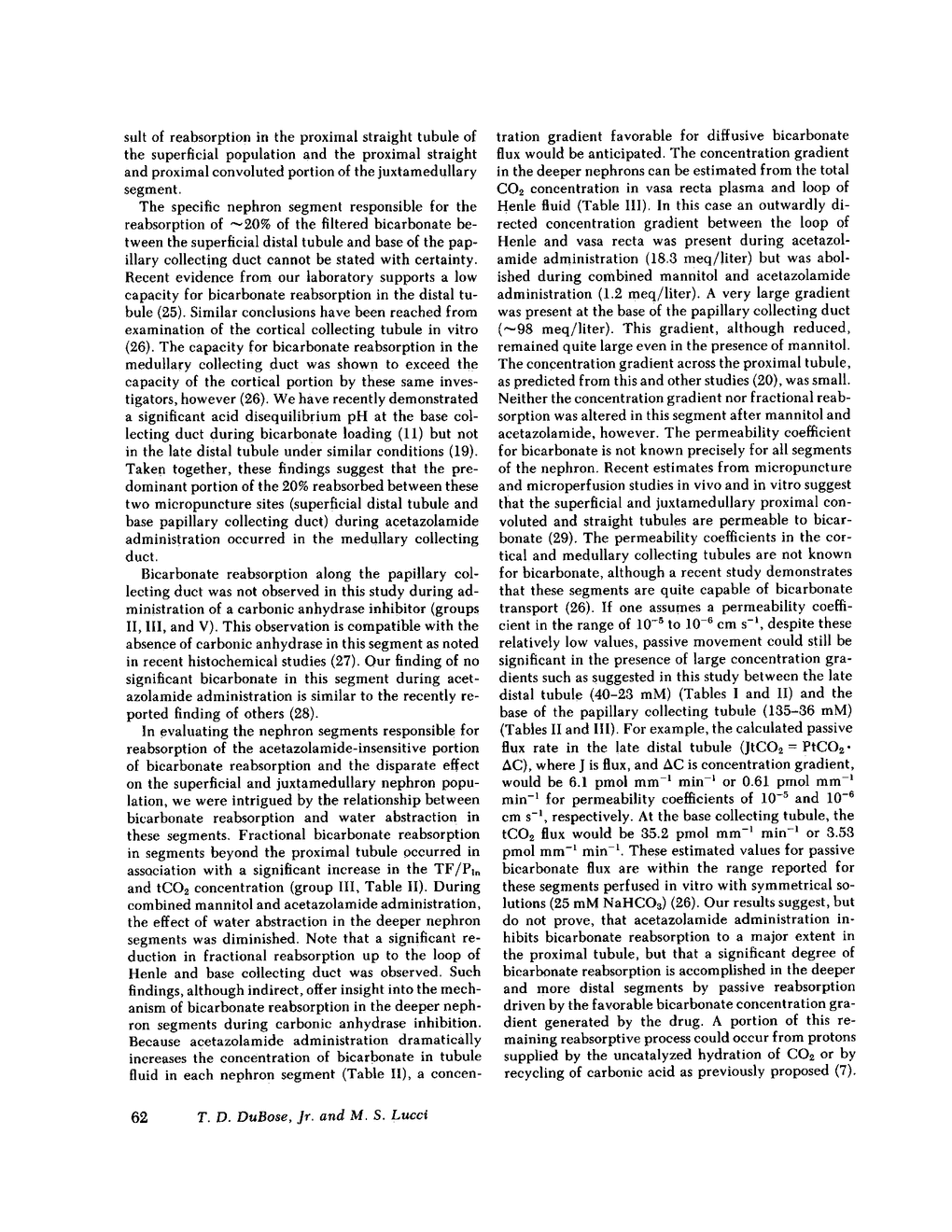 The nephron segment responsible for the acetazolamide-insensitive fraction of renal bicarbonate reabsorption has not been clearly delineated. This study compares superficial and deep nephron bicarbonate reabsorption before and after acetazolamide at two dose levels (20 and 50 mg/kg per h) in mutant Munich-Wistar rats employing both cortical and papillary micropuncture and microcalorimetry. Systemic acid-base balance and right whole kidney glomerular filtration rate were similar in all groups examined. The effects of the two doses of acetazolamide were indistinguishable and resulted in a significant increase in whole kidney bicarbonate excretion that compared favorably with the fraction delivered out of the left papillary tip. Acetazolamide inhibited superficial proximal bicarbonate reabsorption by 80.0%, whereas reabsorption up to the deep loop of Henle was decreased by only 52% (P less than 0.001). Bicarbonate reabsorption that was insensitive to acetazolamide occurred in the superficial and deep loop of Henle and between the distal tubule and base collecting duct. Because water reabsorption in these segments could serve to generate transepithelial bicarbonate concentration gradients favorable for reabsorption, we attempted to minimize water abstraction by combined administration of mannitol and acetazolamide. During this condition a significant increase in bicarbonate delivery up to the deep loop of Henle was noted (52 vs. 65%), whereas superficial nephron reabsorption was not altered. Furthermore, an outwardly directed bicarbonate concentration gradient from the deep loop of Henle to vasa recta was demonstrated during acetazolamide (delta tCO2 = 20.9 +/- 3.3 mM), but was abolished during combined mannitol and acetazolamide administration (delta tCO2 = 3.5 +/- 0.9 mM). It is concluded that carbonic anhydrase inhibition results in a disparate effect on nephron bicarbonate reabsorption when juxtamedullary and superficial nephron segments are compared. Our findings suggest that a mechanism for residual bicarbonate reabsorption during acetazolamide administration may be passive reabsorption driven by favorable transepithelial concentration gradients.