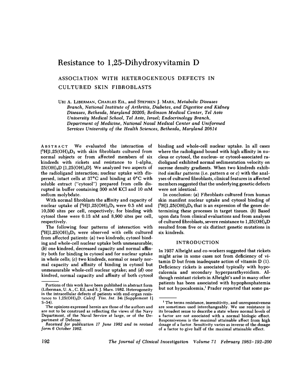 We evaluated the interaction of [3H]1,25(OH)2D3 with skin fibroblasts cultured from normal subjects or from affected members of six kindreds with rickets and resistance to 1-alpha, 25(OH)2D [1,25(OH)2D]. We analyzed two aspects of the radioligand interaction; nuclear uptake with dispersed, intact cells at 37 degrees C and binding at 0 degrees C with soluble extract ("cytosol") prepared from cells disrupted in buffer containing 300 mM KCl and 10 mM sodium molybdate. With normal fibroblasts the affinity and capacity of nuclear uptake of [3H]1,25(OH)2D3 were 0.5 nM and 10,300 sites per cell, respectively; for binding with cytosol these were 0.13 nM and 8,900 sites per cell, respectively. The following four patterns of interaction with [3H]1,25(OH)2D3 were observed with cells cultured from affected patients: (a) two kindreds; cytosol binding and whole-cell nuclear uptake both unmeasurable; (b) one kindred, decreased capacity and normal affinity both for binding in cytosol and for nuclear uptake in whole cells; (c) two kindreds, normal or nearly normal capacity and affinity of binding in cytosol but unmeasurable whole-cell nuclear uptake; and (d) one kindred, normal capacity and affinity of both cytosol binding and whole-cell nuclear uptake. In all cases where the radioligand bound with high affinity in nucleus or cytosol, the nucleus- or cytosol-associated radioligand exhibited normal sedimentation velocity on sucrose density gradients. When two kindreds exhibited similar patterns (i.e. pattern a or c) with the analyses of cultured fibroblasts, clinical features in affected members suggested that the underlying genetic defects were not identical. In conclusion: (a) Fibroblasts cultured from human skin manifest nuclear uptake and cytosol binding of [3H]1,25(OH)2D3 that is an expression of the genes determining these processes in target tissues. (b) Based upon data from clinical evaluations and from analyses of cultured fibroblasts, severe resistance to 1,25(OH)2D resulted from five or six distinct genetic mutations in six kindreds.