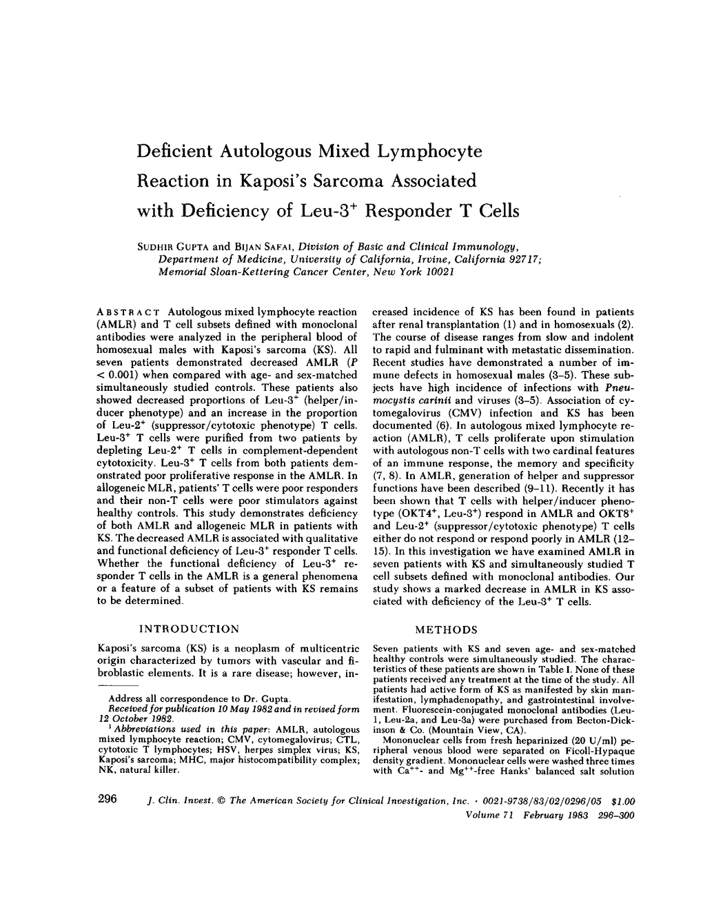 Autologous mixed lymphocyte reaction (AMLR) and T cell subsets defined with monoclonal antibodies were analyzed in the peripheral blood of homosexual males with Kaposi's sarcoma (KS). All seven patients demonstrated decreased AMLR (P less than 0.001) when compared with age- and sex-matched simultaneously studied controls. These patients also showed decreased proportions of Leu-3+ (helper/inducer phenotype) and an increase in the proportion of Leu-2+ (suppressor/cytotoxic phenotype) T cells. Leu-3+ T cells were purified from two patients by depleting Leu-2+ T cells in complement-dependent cytotoxicity. Leu-3+ T cells from both patients demonstrated poor proliferative response in the AMLR. In allogeneic MLR, patients' T cells were poor responders and their non-T cells were poor stimulators against healthy controls. This study demonstrates deficiency of both AMLR and allogeneic MLR in patients with KS. The decreased AMLR is associated with qualitative and functional deficiency of Leu-3+ responder T cells. Whether the functional deficiency of Leu-3+ responder T cells in the AMLR is a general phenomena or a feature of a subset of patients with KS remains to be determined.