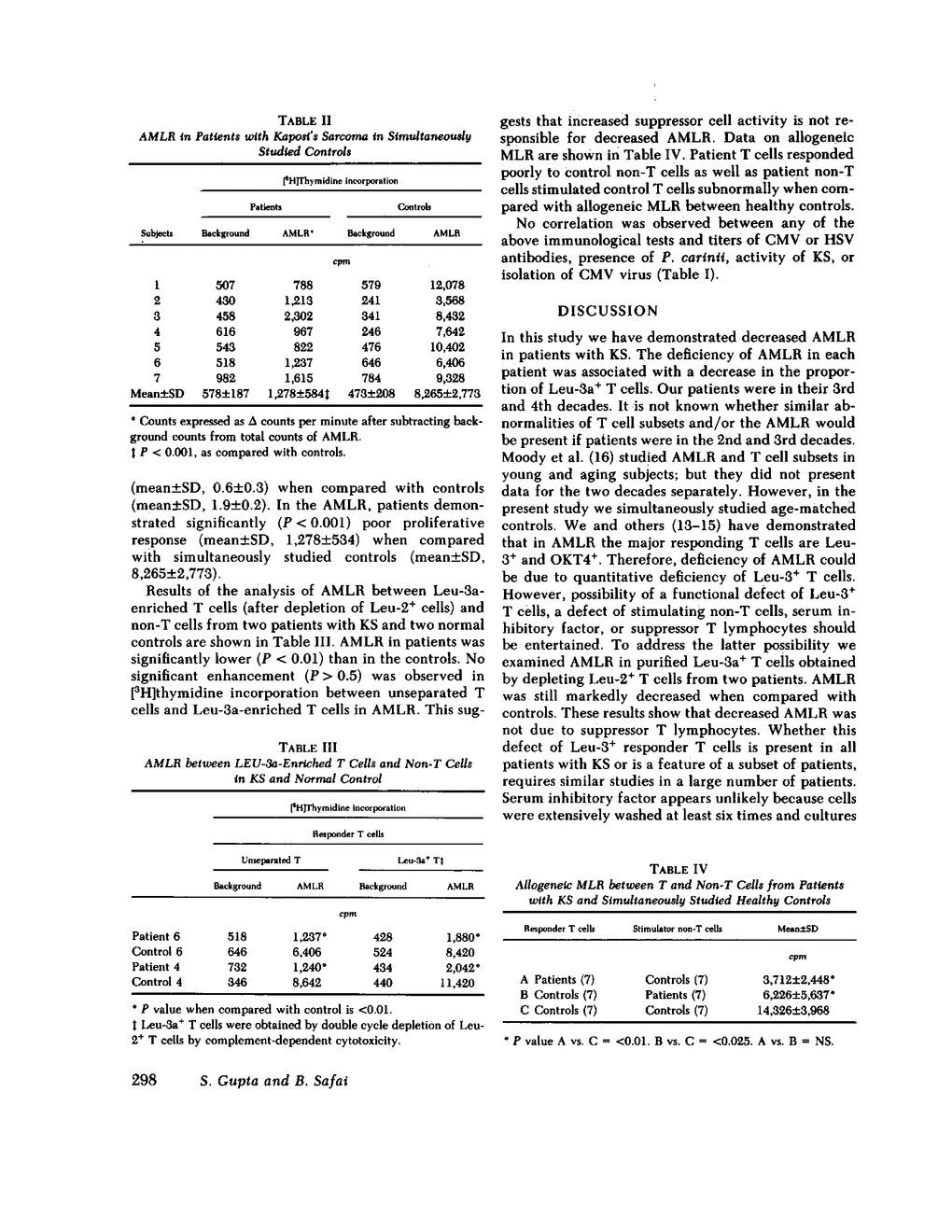 Autologous mixed lymphocyte reaction (AMLR) and T cell subsets defined with monoclonal antibodies were analyzed in the peripheral blood of homosexual males with Kaposi's sarcoma (KS). All seven patients demonstrated decreased AMLR (P less than 0.001) when compared with age- and sex-matched simultaneously studied controls. These patients also showed decreased proportions of Leu-3+ (helper/inducer phenotype) and an increase in the proportion of Leu-2+ (suppressor/cytotoxic phenotype) T cells. Leu-3+ T cells were purified from two patients by depleting Leu-2+ T cells in complement-dependent cytotoxicity. Leu-3+ T cells from both patients demonstrated poor proliferative response in the AMLR. In allogeneic MLR, patients' T cells were poor responders and their non-T cells were poor stimulators against healthy controls. This study demonstrates deficiency of both AMLR and allogeneic MLR in patients with KS. The decreased AMLR is associated with qualitative and functional deficiency of Leu-3+ responder T cells. Whether the functional deficiency of Leu-3+ responder T cells in the AMLR is a general phenomena or a feature of a subset of patients with KS remains to be determined.