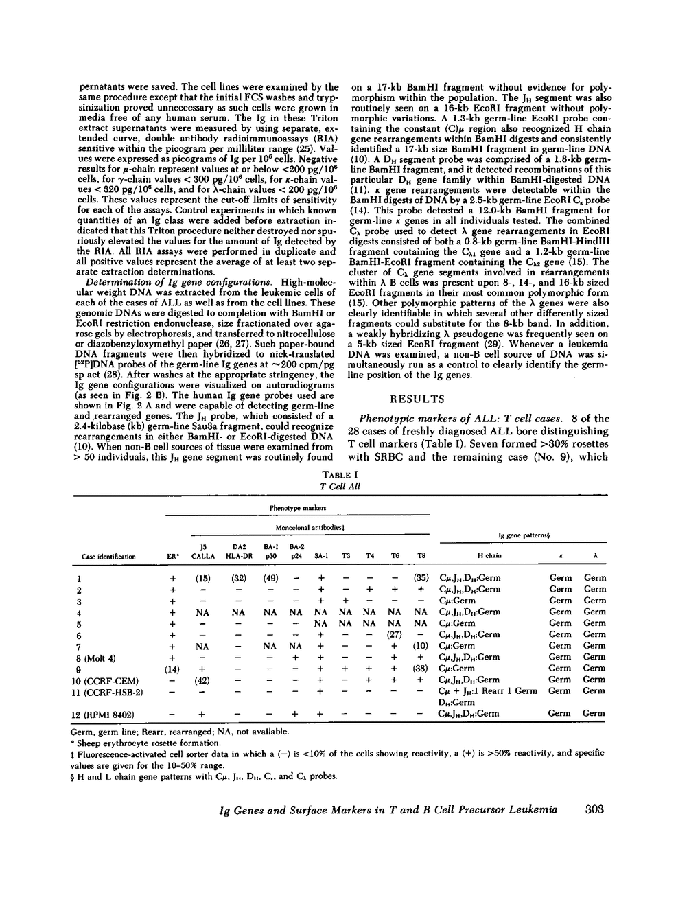 We have explored the relationship among immunoglobulin gene rearrangement, cytoplasmic immunoglobulin production, and cell surface antigen expression within 37 cases of acute lymphocytic leukemia. All 12 cases of the T cell type had germ-line kappa and lambda genes and 11 of 12 had germ-line heavy chain genes. In contrast, all 25 cases of the "non-T, non-B" classification, which lacked both definitive T cell markers and surface immunoglobulin, had rearranged immunoglobulin genes, indicating that they represent precursor cells already committed to the B cell lineage at the gene level. 14 had rearranged heavy chain genes, yet retained germ-line light chain genes, whereas 11 cases had both heavy and light chain gene reorganizations. All patterns of immunoglobulin gene rearrangement predicted by a model that proceeds from heavy chain gene recombination to light chain genes were observed. Despite the uniform presence of rearranged immunoglobulin genes, only five cases produced cytoplasmic mu-chain, one exceptional case produced gamma-chain, and another produced only lambda-chain. The cases of B cell precursor type that do not produce immunoglobulin may represent cells that frequently possess ineffectively rearranged immunoglobulin genes. Included in this group may be a set of cells trapped within the B cell precursor series because their ineffective rearrangements have eliminated certain gene subsegments necessary for the assemblage of an effective heavy chain gene. All seven cases of the non-T, non-B subgroup that bore HLA-DR but lacked CALLA (the common acute lymphocytic leukemia-associated antigen) represented the earliest recognizable stage of B cell precursors with rearranged heavy chain genes but germ-line light chain genes. Correlations here suggest that cells entering B cell development express HLA-DR and rearrange heavy chain genes before the expression of a B cell-associated antigen recognized by the antibody BA-1, the antigen CALLA, and any subsequent light chain gene rearrangements.