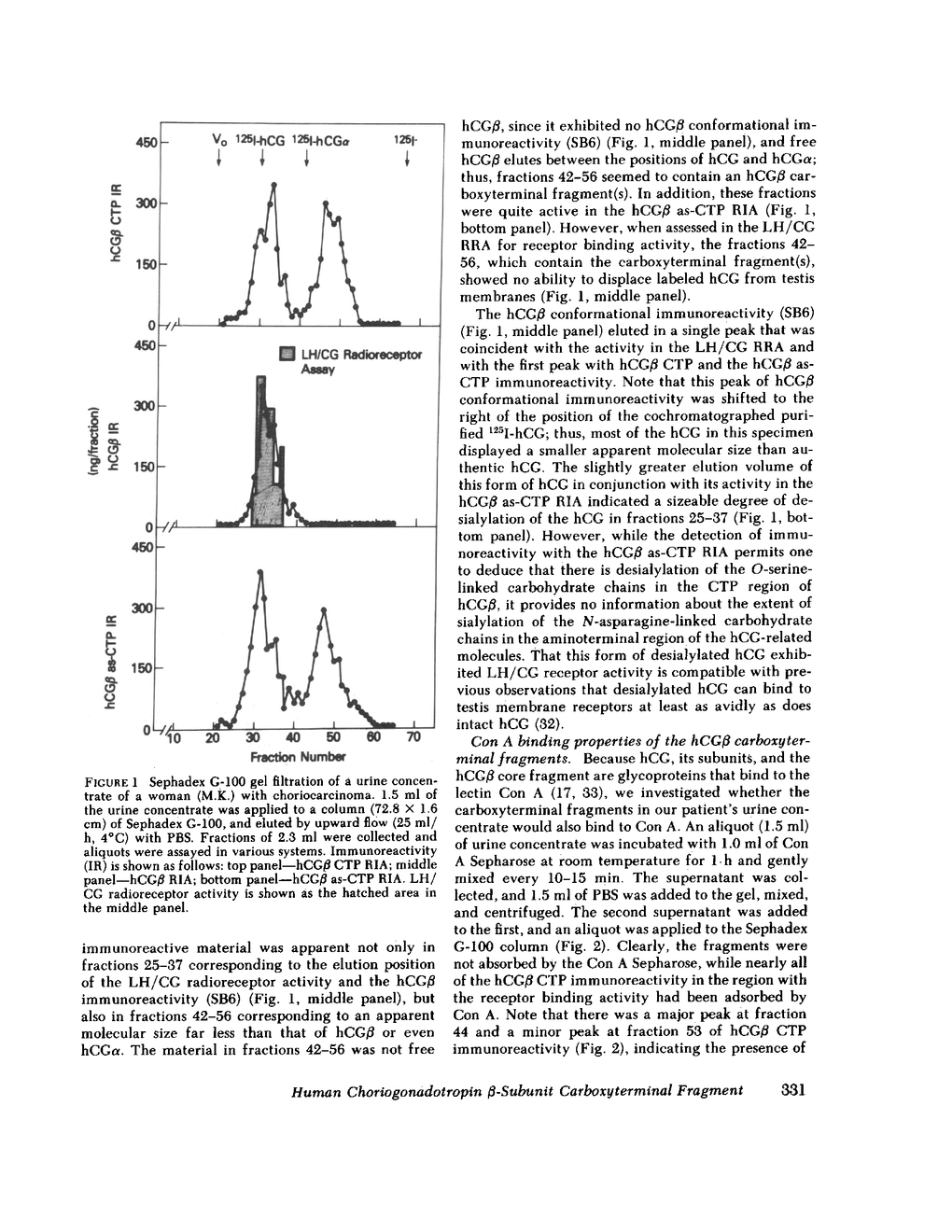 We have observed low-molecular weight carboxyterminal fragments of the human choriogonadotropin (hCG) beta-subunit in the urines of several women with choriocarcinoma, and we have characterized one fragment in detail. Its apparent molecular weight by gel chromatography on Sephadex G-100 was 14,200. The fragment was not adsorbed to concanavalin A-Sepharose, indicating that it lacked the asparagine-linked carbohydrate groups of intact hCG beta. It was active in radioimmunoassays (RIA) using antisera either to the hCG beta carboxyterminal peptide (CTP) or to the desialylated hCG beta CTP (hCG beta as-CTP), indicating the presence of not only the hCG beta carboxyterminus but also desialylated O-serine-linked carbohydrate side chains on the fragment. It lacked luteinizing hormone/choriogonadotropin radioreceptor activity and hCG beta conformational immunoreactivity (SB6 RIA). On Sephadex G-100 gel chromatography, the elution profiles of this fragment and the hCG beta as-CTP(115-145) prepared by trypsin digestion of as-hCG were essentially indistinguishable (apparent molecular weights 14,200 and 14,000, respectively). The immunological characteristics of the fragment in both hCG beta CTP and hCG beta as-CTP RIA were indistinguishable from those of the hCG beta as-CTP(115-145) glycopeptide. Carboxyterminal fragments of hCG beta were evident in urine specimens obtained from 10 of 11 patients with choriocarcinoma but not in those obtained from normal subjects who were given an intravenous infusion of highly purified hCG. Of six pregnant women, only the one at term excreted carboxyterminal fragments of hCG beta and then only in trace amounts. We conclude that hCG beta carboxyterminal fragments, including one that is indistinguishable from the tryptic glycopeptide hCG beta as-CTP(115-145), can occur naturally in the urine of patients with choriocarcinoma.