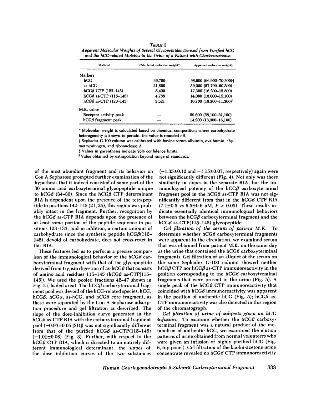 We have observed low-molecular weight carboxyterminal fragments of the human choriogonadotropin (hCG) beta-subunit in the urines of several women with choriocarcinoma, and we have characterized one fragment in detail. Its apparent molecular weight by gel chromatography on Sephadex G-100 was 14,200. The fragment was not adsorbed to concanavalin A-Sepharose, indicating that it lacked the asparagine-linked carbohydrate groups of intact hCG beta. It was active in radioimmunoassays (RIA) using antisera either to the hCG beta carboxyterminal peptide (CTP) or to the desialylated hCG beta CTP (hCG beta as-CTP), indicating the presence of not only the hCG beta carboxyterminus but also desialylated O-serine-linked carbohydrate side chains on the fragment. It lacked luteinizing hormone/choriogonadotropin radioreceptor activity and hCG beta conformational immunoreactivity (SB6 RIA). On Sephadex G-100 gel chromatography, the elution profiles of this fragment and the hCG beta as-CTP(115-145) prepared by trypsin digestion of as-hCG were essentially indistinguishable (apparent molecular weights 14,200 and 14,000, respectively). The immunological characteristics of the fragment in both hCG beta CTP and hCG beta as-CTP RIA were indistinguishable from those of the hCG beta as-CTP(115-145) glycopeptide. Carboxyterminal fragments of hCG beta were evident in urine specimens obtained from 10 of 11 patients with choriocarcinoma but not in those obtained from normal subjects who were given an intravenous infusion of highly purified hCG. Of six pregnant women, only the one at term excreted carboxyterminal fragments of hCG beta and then only in trace amounts. We conclude that hCG beta carboxyterminal fragments, including one that is indistinguishable from the tryptic glycopeptide hCG beta as-CTP(115-145), can occur naturally in the urine of patients with choriocarcinoma.