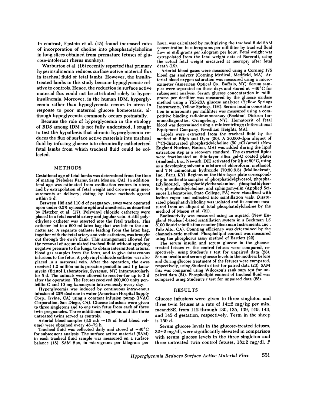I tested the hypothesis that chronic hyperglycemia alters fetal lung maturation by continuous infusion of glucose (14±2 mg/kg per min, mean±SE) from 112 up to 145 d gestation into six chronically catheterized fetal lambs from which tracheal fluid could be collected. Serum glucose levels (32±2 mg/dl) and serum insulin levels (38±4 μU/ml) in these glucose-treated fetuses were significantly higher than serum glucose levels (18±2 mg/dl, P < 0.001) and serum insulin levels (12±3 μU/ml, P < 0.001) in six chronically catheterized control fetuses of the same gestational ages. Glucose infusion to the fetuses did not alter maternal serum glucose (60±3 mg/dl) or serum insulin levels (35±5 μU/ml). Arterial blood gases (pH 7.34±0.01, Po2 24.3±0.5 mmHg, Pco2 41.5±0.9 mmHg), oxygen saturation (73±2%), hematocrit (31±1%), and tracheal fluid flow (2.4±0.1 ml/g per h) in the glucose-treated fetuses were not significantly different from controls. Among the control fetuses, surface active material (SAM) began to appear in tracheal fluid at 123 d gestation and was present in all six fetuses by 129 d gestation, whereas SAM did not appear at all in tracheal fluid of four of the glucose-treated fetuses, and appeared in two at low levels after 142 d gestation. SAM flux in the glucose-treated fetuses (<1 μg/g per h) was statistically lower than SAM flux in the control fetuses (60±9 μg/kg per h, P < 0.001). Between 130 and 140 d gestation, tracheal fluid phospholipid content rose fourfold, mixed lecithin content rose ninefold, disaturated phosphatidylcholine content rose fourfold in the control fetuses, whereas little or no increase in these measurements occurred in the glucose-treated fetuses (all differences significant). I conclude that chronic hyperglycemia with secondary hyperinsulinemia reduces SAM flux in tracheal fluid of fetal lambs. The reduction in SAM flux is attributed to low surface active phospholipid content of the SAM. A similar mechanism may operate in utero to cause respiratory distress in infants of diabetic mothers whose maternal glucose homeostasis is poorly controlled.