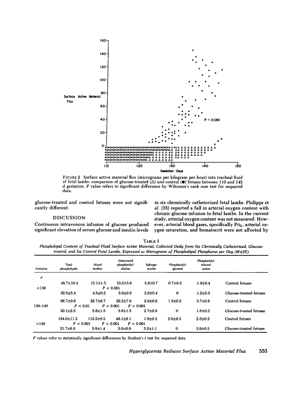 I tested the hypothesis that chronic hyperglycemia alters fetal lung maturation by continuous infusion of glucose (14±2 mg/kg per min, mean±SE) from 112 up to 145 d gestation into six chronically catheterized fetal lambs from which tracheal fluid could be collected. Serum glucose levels (32±2 mg/dl) and serum insulin levels (38±4 μU/ml) in these glucose-treated fetuses were significantly higher than serum glucose levels (18±2 mg/dl, P < 0.001) and serum insulin levels (12±3 μU/ml, P < 0.001) in six chronically catheterized control fetuses of the same gestational ages. Glucose infusion to the fetuses did not alter maternal serum glucose (60±3 mg/dl) or serum insulin levels (35±5 μU/ml). Arterial blood gases (pH 7.34±0.01, Po2 24.3±0.5 mmHg, Pco2 41.5±0.9 mmHg), oxygen saturation (73±2%), hematocrit (31±1%), and tracheal fluid flow (2.4±0.1 ml/g per h) in the glucose-treated fetuses were not significantly different from controls. Among the control fetuses, surface active material (SAM) began to appear in tracheal fluid at 123 d gestation and was present in all six fetuses by 129 d gestation, whereas SAM did not appear at all in tracheal fluid of four of the glucose-treated fetuses, and appeared in two at low levels after 142 d gestation. SAM flux in the glucose-treated fetuses (<1 μg/g per h) was statistically lower than SAM flux in the control fetuses (60±9 μg/kg per h, P < 0.001). Between 130 and 140 d gestation, tracheal fluid phospholipid content rose fourfold, mixed lecithin content rose ninefold, disaturated phosphatidylcholine content rose fourfold in the control fetuses, whereas little or no increase in these measurements occurred in the glucose-treated fetuses (all differences significant). I conclude that chronic hyperglycemia with secondary hyperinsulinemia reduces SAM flux in tracheal fluid of fetal lambs. The reduction in SAM flux is attributed to low surface active phospholipid content of the SAM. A similar mechanism may operate in utero to cause respiratory distress in infants of diabetic mothers whose maternal glucose homeostasis is poorly controlled.