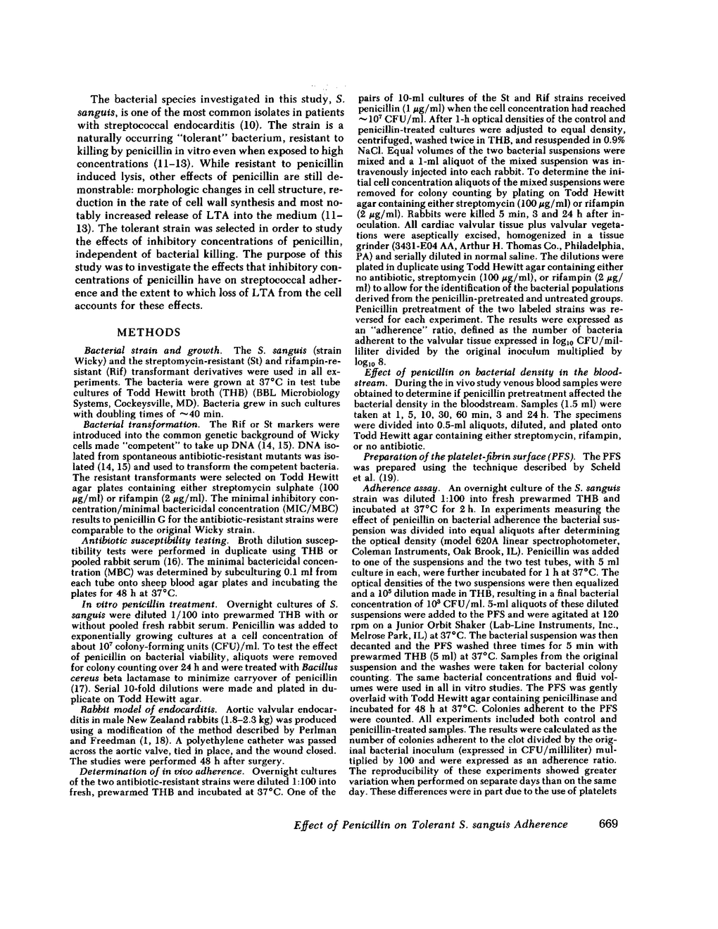 The effect of penicillin treatment of Streptococcus sanguis in vitro, on subsequent bacterial density in the bloodstream and on cardiac valves in the rabbit model of endocarditis was studied. As experimental tools for this study, isogenic pairs of S. sanguis differing in resistance to streptomycin or rifampin were prepared by genetic transformation. Rabbits with traumatized heart valves received an intravenous inoculation of penicillin treated (1 μg/ml) and untreated S. sanguis, each marked by resistance to either streptomycin or rifampin. The number of penicillin-treated and untreated bacteria attached to the valvular surfaces was determined by differential counting on streptomycin or rifampin containing media. Penicillin pretreatment reduced cardiac valve colonization 5 min after inoculation (“adherence ratio” × 108 was 4.11 for the control and 3.66 for the penicillin-treated bacteria, P < 0.001). The results were not due to differences in serum killing or bacterial densities in the bloodstream. There was no difference in valvular bacterial densities 24 h after bacterial inoculation (adherence ratio × 108, 7.26 untreated vs. 6.34 penicillin-pretreated, P > 0.10).