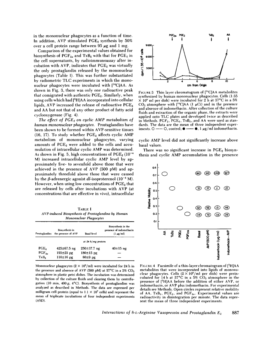 The effect of 8-L-arginine vasopressin (AVP) on biosynthesis of prostaglandins in human mononuclear phagocytes was examined. AVP, oxytocin, and deamino-(8-D-arginine) vasopressin (dDAVP) affected prostaglandin biosynthesis in a rank order that parallels their pressor but not antidiuretic activity (AVP greater than oxytocin greater than dDAVP). Radioimmunoassay, incorporation studies using [14C]arachidonic acid and radiometric thin-layer chromatography, revealed prostaglandin E2 (PGE2) to be the only prostaglandin synthesized by the mononuclear phagocytes. While high concentrations of PGE2 elevated cytoplasmic levels of cyclic AMP by five- to sevenfold above basal values, low concentrations of PGE2 that are released by the cells in the presence of AVP failed to increase cyclic AMP content in the cells. However, PGE2 at concentrations that do not alter cyclic AMP levels markedly interferes with the activity of AVP. This effect is, however, very time dependent. Addition of PGE2 to the cells 30 min before AVP, was followed by a period of unresponsiveness to the hormone that lasts at least 30 min. Pretreatment of the cells with indomethacin enhanced the AVP-mediated accumulation of intracellular cyclic AMP level. PGE2 did not modify [3H]AVP binding, indicating that its inhibitory effect on the activity of the peptide is not due to downregulation of vasopressin receptors.