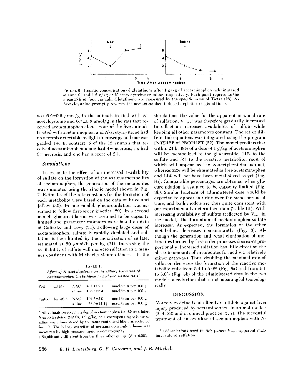 N-Acetylcysteine is the drug of choice for the treatment of an acetaminophen overdose. It is thought to provide cysteine for glutathione synthesis and possibly to form an adduct directly with the toxic metabolite of acetaminophen, N-acetyl-p-benzoquinoneimine. However, these hypothese have not been tested in vivo, and other mechanisms of action such as reduction of the quinoneimine might be responsible for the clinical efficacy of N-acetylcysteine. After the administration to rats of acetaminophen (1 g/kg) intraduodenally (i.d.) and of [35S]-N-acetylcysteine (1.2 g/kg i.d.), the specific activity of the N-acetylcysteine adduct of acetaminophen (mercapturic acid) isolated from urine and assayed by high pressure liquid chromatography averaged 76±6% of the specific activity of the glutathione-acetaminophen adduct excreted in bile, indicating that virtually all N-acetylcysteine-acetaminophen originated from the metabolism of the glutathione-acetaminophen adduct rather than from a direct reaction with the toxic metabolite. N-Acetylcysteine promptly reversed the acetaminophen-induced depletion of glutathione by increasing glutathione synthesis from 0.54 to 2.69 μmol/g per h. Exogenous N-acetylcysteine did not increase the formation of the N-acetylcysteine and glutathione adducts of acetaminophen in fed rats. However, when rats were fasted before the administration of acetaminophen, thereby increasing the stress on the glutathione pool, exogenous N-acetylcysteine significantly increased the formation of the acetaminophen-glutathione adduct from 57 to 105 nmol/min per 100 g. Although the excretion of acetaminophen sulfate increased from 85±15 to 211±17 μmol/100 g per 24 h after N-acetylcysteine, kinetic simulations showed that increased sulfation does not significantly decrease formation of the toxic metabolite. Reduction of the benzoquinoneimine by N-acetylcysteine should result in the formation of N-acetylcysteine disulfides and glutathione disulfide via thiol-disulfide exchange. Acetaminophen alone depleted intracellular glutathione, and led to a progressive decrease in the biliary excretion of glutathione and glutathione disulfide. N-Acetylcysteine alone did not affect the biliary excretion of glutathione disulfide. However, when administered after acetaminophen. N-acetylcysteine produced a marked increase in the biliary excretion of glutathione disulfide from 1.2±0.3 nmol/min per 100 g in control animals to 5.7±0.8 nmol/min per 100 g. Animals treated with acetaminophen and N-acetylcysteine excreted 2.7±0.8 nmol/min per 100 g of N-acetylcysteine disulfides (measured by high performance liquid chromatography) compared to 0.4±0.1 nmol/min per 100 g in rats treated with N-acetylcysteine alone. In conclusion, exogenous N-acetylcysteine does not form significant amounts of conjugate with the reactive metabolite of acetaminophen in the rat in vivo but increases glutathione synthesis, thus providing more substrate for the detoxification of the reactive metabolite in the early phase of an acetaminophen intoxication when the critical reaction with vital macromolecules occurs.