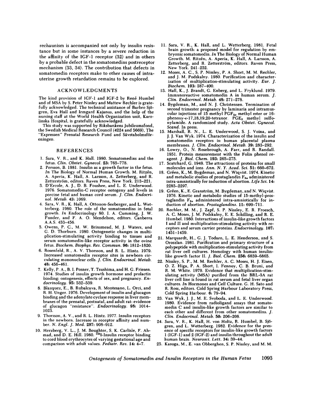 This study examines the ontogenesis of somatomedin and insulin receptors in man. Particulate plasma membranes were prepared by ultracentrifugation from various tissues removed from fetuses after abortion and classified as less than 17, 17-25, and greater than 25 cm in length. The binding of iodinated insulinlike growth factors 1 (IGF-1) and 2 (IGF-2), somatomedin A (SMA), multiplication-stimulating activity (MSA), and insulin was examined at the different ages. In the liver, cross-reaction studies revealed separate insulin and IGF-2 receptors. The Scatchard plots of insulin binding to liver membranes were curvilinear and showed an increase in the concentration of insulin receptors with advancing age. A single IGF-2 receptor was found on liver and no alteration was observed during development. The brain contained a lower concentration of insulin receptors. A change in the brain receptors for somatomedins occurred during development. Early in gestation, a high concentration of a low-affinity IGF-1 receptor was found. After approximately the 17th wk of gestation a higher affinity IGF-1 receptor appeared, which then increased in concentration. Cross-reaction studies also revealed changes in the specificity of these receptors during development. In the youngest fetal group IGF-2 was preferentially bound. Around midgestation a separate IGF-1 receptor, indicated by the preferential displacement of iodinated IGF-1 by IGF-1, appeared. In contrast, iodinated IGF-2 bound to a receptor where IGF-1 and IGF-2 were equipotent.