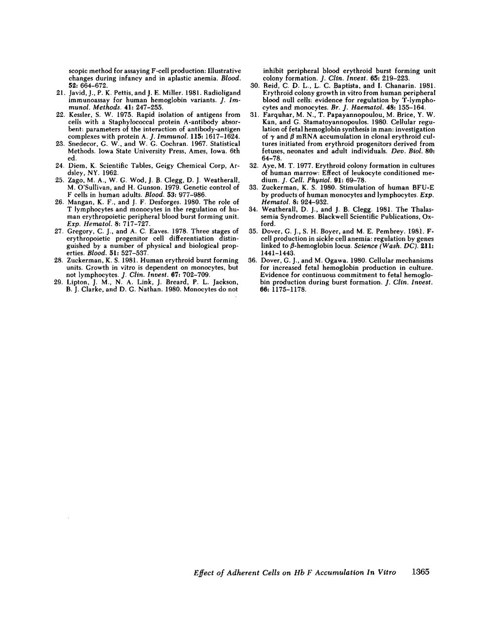In clonal cultures of erythroid burst-forming units (BFU-E) obtained from blood, the accumulation of fetal and adult hemoglobins (Hb F and Hb A) was measured by radioligand immunoassay. Inclusion of adherent mononuclear cells in the culture promoted a striking increase in the relative amount of Hb F in each of 44 experiments with 14 donors. In two-thirds of the instances, this was accounted for by a selective increase in the absolute amount of Hb F. The differential effect on Hb F and Hb A accumulation was achieved without altering the maturity of the erythroid cells, their mean hemoglobin content, or the asynchrony of the production of the two hemoglobins. Virtually all bursts produced Hb F, and the population of BFU-E as a whole, rather than a selected subset, appeared to be the target of adherent cell action. When the adherent cells were excluded from the culture input, the base-line value of Hb F was reproducible for each donor over a period of several months, and correlated with the number of in vivo circulating F cells.
