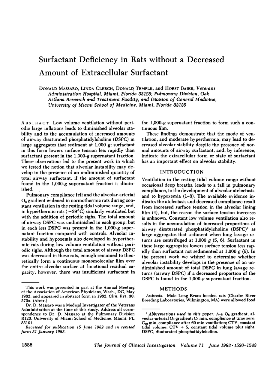 Low volume ventilation without periodic large inflations leads to diminished alveolar stability and to the accumulation of increased amounts of airway disaturated phosphatidylcholine (DSPC) in large aggregates that sediment at 1,000 g; surfactant in this form lowers surface tension less rapidly than surfactant present in the 1,000-g supernatant fraction. These observations led to the present work in which we tested the notion that alveolar instability may develop in the presence of an undiminished quantity of total airway surfactant, if the amount of surfactant found in the 1,000-g supernatant fraction is diminished. Pulmonary compliance fell and the alveolar-arterial O2 gradient widened in normothermic rats during constant ventilation in the resting tidal volume range, and, in hyperthermic rats (approximately 39 degrees C) similarly ventilated but with the addition of periodic sighs. The total amount of airway DSPC was undiminished in each group, but in each less DSPC was present in the 1,000-g supernatant fraction compared with controls. Alveolar instability and hypoxemia also developed in hyperthermic rats during low volume ventilation without periodic sighs. Although the total amount of airway DSPC was decreased in these rats, enough remained to theoretically form a continuous monomolecular film over the entire alveolar surface at functional residual capacity; however, there was insufficient surfactant in the 1,000-g supernatant fraction to form such a continuous film. These findings demonstrate that the mode of ventilation, and moderate hyperthermia, may lead to decreased alveolar stability despite the presence of normal amounts of airway surfactant, and, by inference, indicate the extracellular form or state of surfactant has an important effect on alveolar stability.