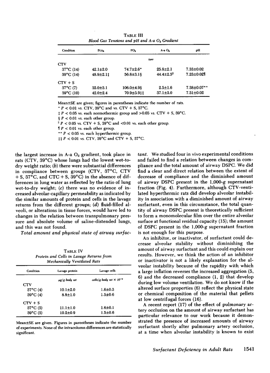 Low volume ventilation without periodic large inflations leads to diminished alveolar stability and to the accumulation of increased amounts of airway disaturated phosphatidylcholine (DSPC) in large aggregates that sediment at 1,000 g; surfactant in this form lowers surface tension less rapidly than surfactant present in the 1,000-g supernatant fraction. These observations led to the present work in which we tested the notion that alveolar instability may develop in the presence of an undiminished quantity of total airway surfactant, if the amount of surfactant found in the 1,000-g supernatant fraction is diminished. Pulmonary compliance fell and the alveolar-arterial O2 gradient widened in normothermic rats during constant ventilation in the resting tidal volume range, and, in hyperthermic rats (approximately 39 degrees C) similarly ventilated but with the addition of periodic sighs. The total amount of airway DSPC was undiminished in each group, but in each less DSPC was present in the 1,000-g supernatant fraction compared with controls. Alveolar instability and hypoxemia also developed in hyperthermic rats during low volume ventilation without periodic sighs. Although the total amount of airway DSPC was decreased in these rats, enough remained to theoretically form a continuous monomolecular film over the entire alveolar surface at functional residual capacity; however, there was insufficient surfactant in the 1,000-g supernatant fraction to form such a continuous film. These findings demonstrate that the mode of ventilation, and moderate hyperthermia, may lead to decreased alveolar stability despite the presence of normal amounts of airway surfactant, and, by inference, indicate the extracellular form or state of surfactant has an important effect on alveolar stability.
