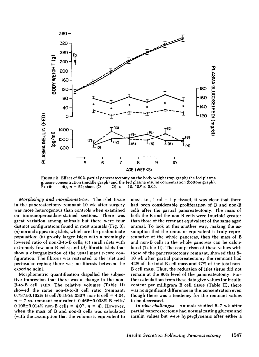 To define the consequences of a known reduction of B cell mass in rats, 90% partial pancreatectomies were performed. For the 6 wk following surgery moderate hyperglycemia was maintained in the fed state but there were no differences in body weight nor plasma insulin concentrations compared with sham-pancreatectomized controls. 8-10 wk following surgery regeneration of the remnant was evident with remnant weight being 26%, B cell mass being 42%, and non-B cell mass being 47% of values found for control whole pancreas. There were comparable increases in the remnant content of insulin, glucagon, and somatostatin. Following meal challenges, intraperitoneal and intravenous glucose tolerance tests and intravenous arginine challenge given 6-7 wk after surgery, the insulin responses to glucose were blunted or absent but the responses following the meals or arginine were intact. Similarly, when the pancreatic remnant was perfused in vitro, insulin release after challenge with 300 mg/dl glucose was markedly reduced whereas intact responsiveness to 10 mM arginine was retained. These data suggest that the chronic stimulation of a reduced B cell mass can lead to a selective loss of glucose-induced insulin secretion.