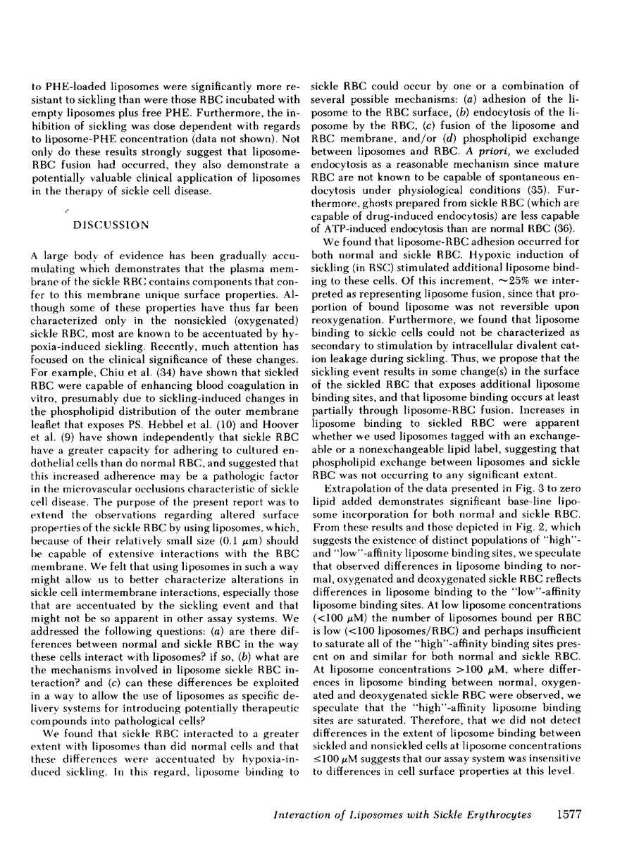 The sickle erythrocyte (RBC) is a pathologic RBC that contains multiple membrane abnormalities. Some of these abnormalities have been implicated in the pathophysiology of vasoocclusive crises characteristic of sickle cell disease; others have yet to be defined in terms of their clinical significance. Recent information has shown that sickle RBC adhere abnormally to cultured endothelial cells yet little is known about the ways in which sickle cells interact with model membranes of defined size and lipid composition. We investigated this phenomenon by interacting sickle RBC with artificial lipid vesicles (liposomes) containing acidic phospholipids. Our results demonstrate that sickle disease (hemoglobin SS) RBC bind more of these liposomes than do normal or sickle trait (hemoglobin AS) RBC and that these differences are accentuated by hypoxia-induced sickling. Binding of liposome phospholipid to sickled RBC was not attributable to phospholipid exchange between liposomes and RBC and was consistent with a mechanism involving both membrane fusion and a stable reversible adhesion of liposomes to the RBC membrane.
