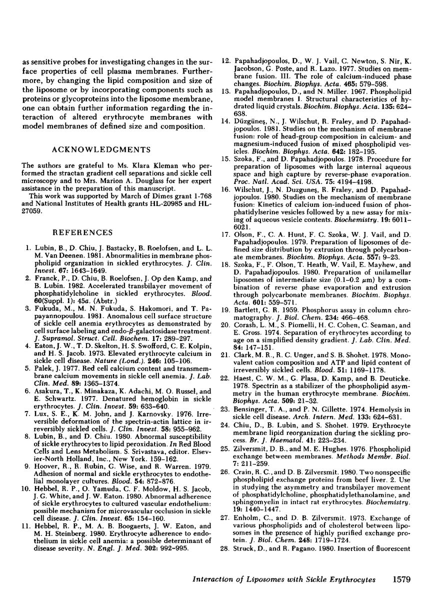 The sickle erythrocyte (RBC) is a pathologic RBC that contains multiple membrane abnormalities. Some of these abnormalities have been implicated in the pathophysiology of vasoocclusive crises characteristic of sickle cell disease; others have yet to be defined in terms of their clinical significance. Recent information has shown that sickle RBC adhere abnormally to cultured endothelial cells yet little is known about the ways in which sickle cells interact with model membranes of defined size and lipid composition. We investigated this phenomenon by interacting sickle RBC with artificial lipid vesicles (liposomes) containing acidic phospholipids. Our results demonstrate that sickle disease (hemoglobin SS) RBC bind more of these liposomes than do normal or sickle trait (hemoglobin AS) RBC and that these differences are accentuated by hypoxia-induced sickling. Binding of liposome phospholipid to sickled RBC was not attributable to phospholipid exchange between liposomes and RBC and was consistent with a mechanism involving both membrane fusion and a stable reversible adhesion of liposomes to the RBC membrane.