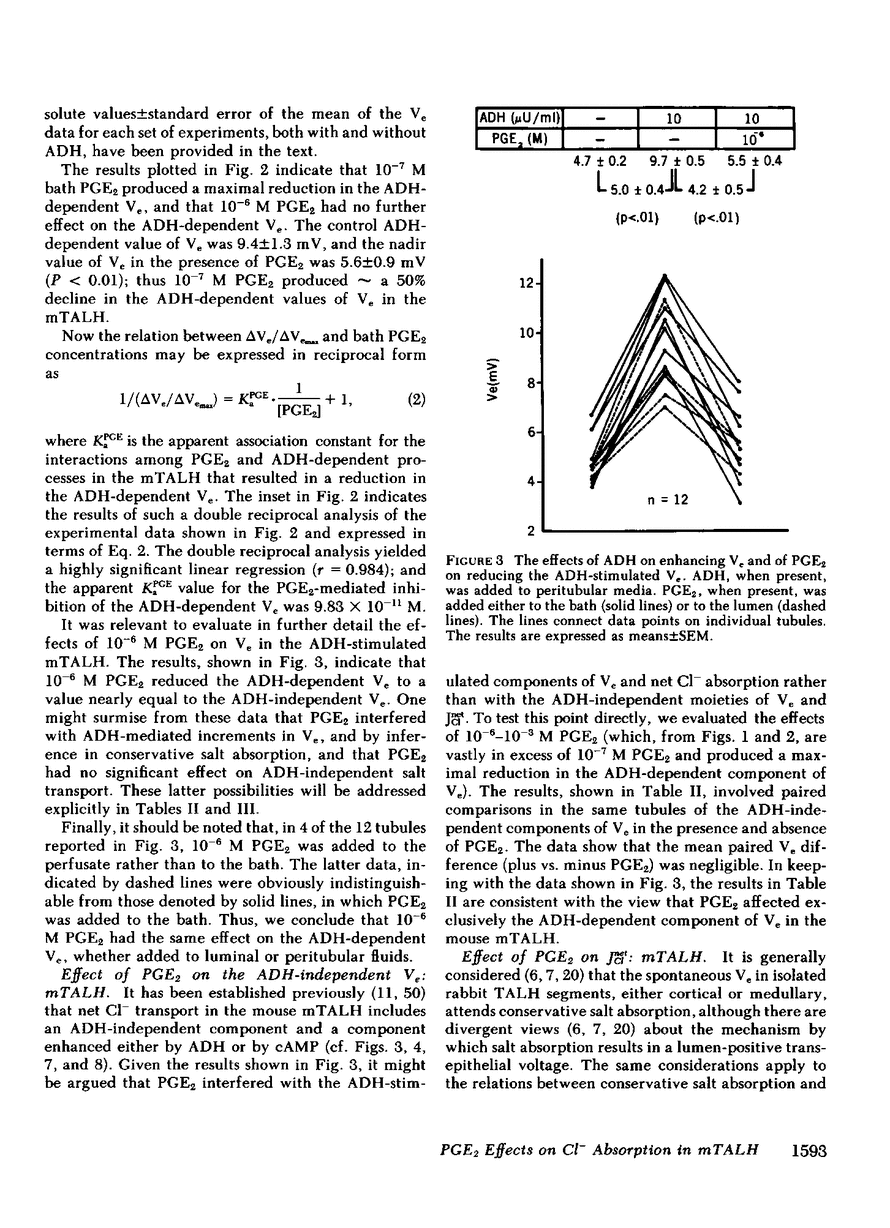 This paper describes the inhibitory effect of prostaglandin E2 (PGE2) on antidiuretic hormone (ADH)-stimulated net Cl- absorption and spontaneous transepithelial voltage (Ve) in single medullary thick ascending limbs of Henle (TALH, thick ascending limb; mTALH, medullary segment; cTALH, cortical segment) obtained from mouse kidney. The experimental data indicate that PGE2 reduced the ADH-dependent values of net Cl- absorption (JnetCl, eq cm-2 s-1) and Ve (mV) in a dose-dependent manner; that increasing concentrations of peritubular ADH reversed the PGE2-mediated reductions in the ADH-dependent moiety of Ve in the mouse mTALH; that PGE2 had no effect on cyclic AMP-stimulated increments in Ve in the mouse mTALH; and that PGE2 had no effect on Ve in the cTALH, where Ve is unaffected either by ADH or by cyclic AMP. These effects might be obtained because of a direct competition between ADH and PGE2 for receptor binding on basolateral membranes. Alternatively, PGE2 might have reduced the affinities between ADH-receptor units and a component(s) of the series of processes leading to adenyl cyclase activation. The latter argument requires that basolateral membranes of the mouse mTALH exhibit receptor reserve, i.e., at the minimum concentration of ADH required to enhance Ve and JnetCl maximally, a fraction of basolateral membrane ADH receptors were unoccupied. According to this view, increasing peritubular ADH concentrations might reverse the PGE2-mediated reduction in ADH-dependent salt transport by increasing the number of basolateral membrane receptors occupied by ADH.