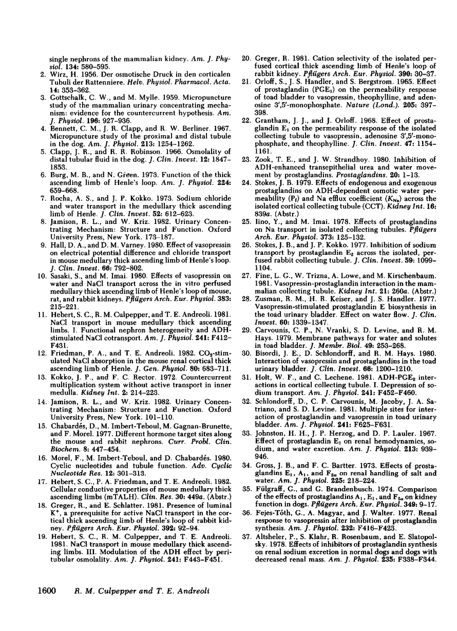 This paper describes the inhibitory effect of prostaglandin E2 (PGE2) on antidiuretic hormone (ADH)-stimulated net Cl- absorption and spontaneous transepithelial voltage (Ve) in single medullary thick ascending limbs of Henle (TALH, thick ascending limb; mTALH, medullary segment; cTALH, cortical segment) obtained from mouse kidney. The experimental data indicate that PGE2 reduced the ADH-dependent values of net Cl- absorption (JnetCl, eq cm-2 s-1) and Ve (mV) in a dose-dependent manner; that increasing concentrations of peritubular ADH reversed the PGE2-mediated reductions in the ADH-dependent moiety of Ve in the mouse mTALH; that PGE2 had no effect on cyclic AMP-stimulated increments in Ve in the mouse mTALH; and that PGE2 had no effect on Ve in the cTALH, where Ve is unaffected either by ADH or by cyclic AMP. These effects might be obtained because of a direct competition between ADH and PGE2 for receptor binding on basolateral membranes. Alternatively, PGE2 might have reduced the affinities between ADH-receptor units and a component(s) of the series of processes leading to adenyl cyclase activation. The latter argument requires that basolateral membranes of the mouse mTALH exhibit receptor reserve, i.e., at the minimum concentration of ADH required to enhance Ve and JnetCl maximally, a fraction of basolateral membrane ADH receptors were unoccupied. According to this view, increasing peritubular ADH concentrations might reverse the PGE2-mediated reduction in ADH-dependent salt transport by increasing the number of basolateral membrane receptors occupied by ADH.
