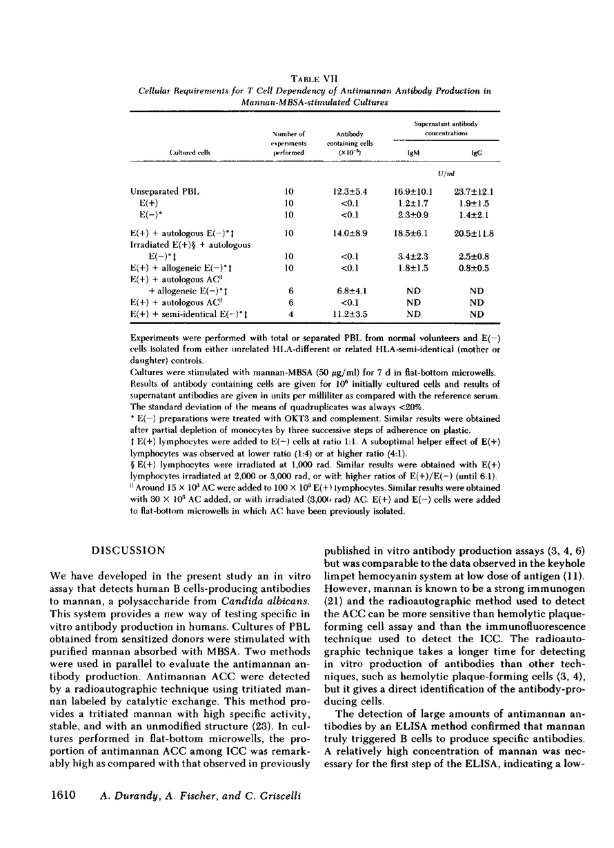 We have developed a new antigenic system for the induction of specific in vitro antibody response in man. The antigen used was purified from the cell wall of Candida albicans strain A and contained greater than 96% polysaccharide mannan. Peripheral blood mononuclear cells from Candida-sensitized donors produced specific antimannan antibodies during a 7-d culture in the presence of mannan absorbed with methylated bovine serum albumin. Two methods were used to detect antimannan antibody responses. Antimannan antibody-producing cells were identified by radioautography with tritiated mannan. Antibody concentration in culture supernatants was measured by an enzyme-linked immunosorbent assay. In both methods, specific IgM and IgG (but not IgA) antibodies were detected. The antibody production to mannan was specific, since an antigenically unrelated polysaccharide (pneumococcal antigen S III) did not bind to methylated bovine serum albumin-mannan-induced blast cells and did not induce antimannan antibody-containing cells. Furthermore, a pulse with an excess of unlabeled mannan abolished [3H]mannan binding, whereas an excess of unlabeled S III did not. Similarly, no antimannan antibody was obtained in influenza virus-stimulated cultures and mannan-stimulated cultures were not inducing antiinfluenza antibodies. The antimannan antibody production was shown to be a T cell-dependent phenomenon. The T helper effect appeared to be radiosensitive. It was under a genetic restriction as it occurred only in autologous or semi-identical but not in allogeneic situations. This system is relatively simple, reproducible, and well suited for the study of specific secondary in vitro antibody responses to polysaccharide antigens in humans.