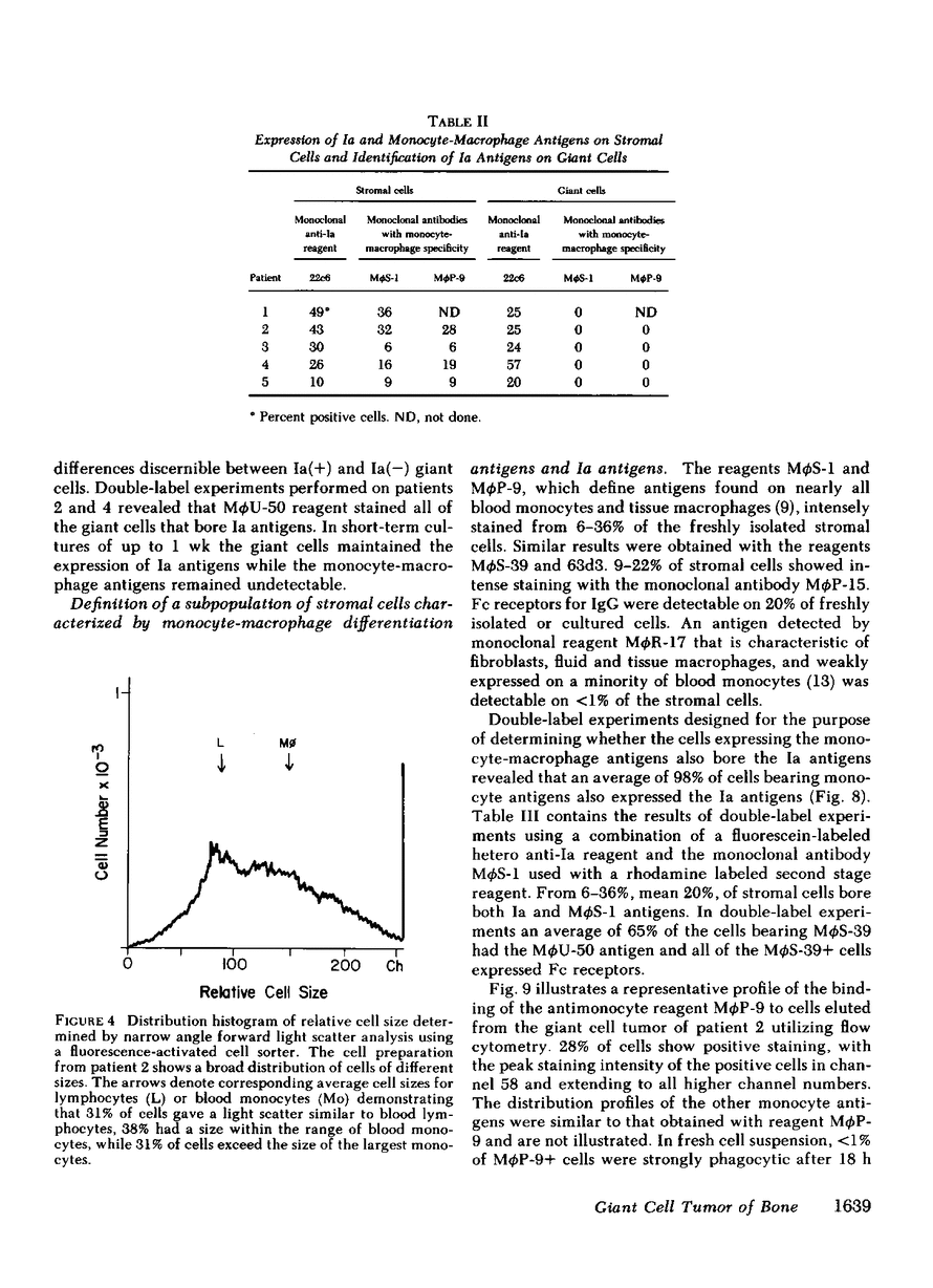 Giant cell tumors of bone dissociated by collagenase digestion were found to be composed of four different cell types defined by morphology, growth in culture, and pattern of staining with monoclonal antibodies. Giant cells comprised an average of 0.8% of the cells recovered, with the remainder consisting of small stromal cells. Of the giant cells, 20-57% expressed Ia antigens, while all lacked IgG Fc receptors and five differentiation antigens associated with mature members of the monocyte-macrophage lineage (M phi S-1, M phi P-9, M phi P-15, M phi S-39, and 63d3). One antigen, M phi U-50, found on early monocytoid forms was expressed on Ia+ giant cells. 6-36% of the remaining stromal tumor cells formed a second subpopulation that assumed either a rounded or elongated shape in culture. These cells bore Ia antigens, IgG Fc receptors, and five antigens of the monocyte-macrophage lineage usually found on blood monocytes. However, these cells differed from monocytes or macrophages in that the antigen M phi R-17 generally found on tissue macrophages was absent, and the M phi U-50 antigen present on more primitive cells was well expressed. A very limited endocytic capacity was demonstrable. A third population of up to 24% of the tumor cells was defined by the presence of intense staining for Ia antigens but the absence of antigens of mature monocytes. A proportion of these cells expressed M phi U-50 and a minority had IgG Fc receptors. The two Ia(+) populations of stromal cells were not identifiable after 2 wk of culture, nor did tumor cells selected for the presence of Ia antigens proliferate in culture. A fourth population of cells lacked Ia and monocyte lineage antigens, but showed pronounced intracellular staining for acid phosphatase. These cells had a distinctive plump epitheloid to fibroblastoid morphology and were readily established in long-term culture where they gave rise to large multinuclear Ia(-) cells containing acid phosphatase. The possibility is discussed that the cell types of these tumors relate to various stages in the development of osteoclasts from precursors in the mononuclear phagocyte lineage.